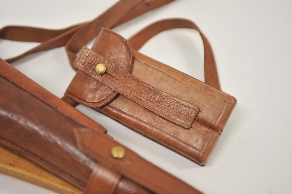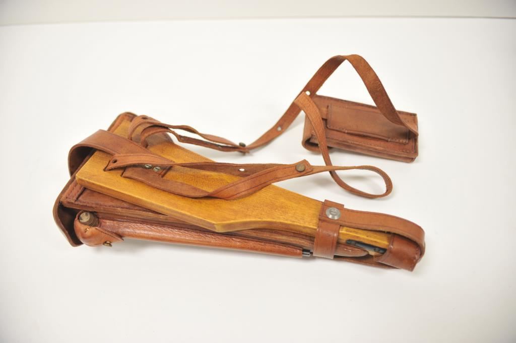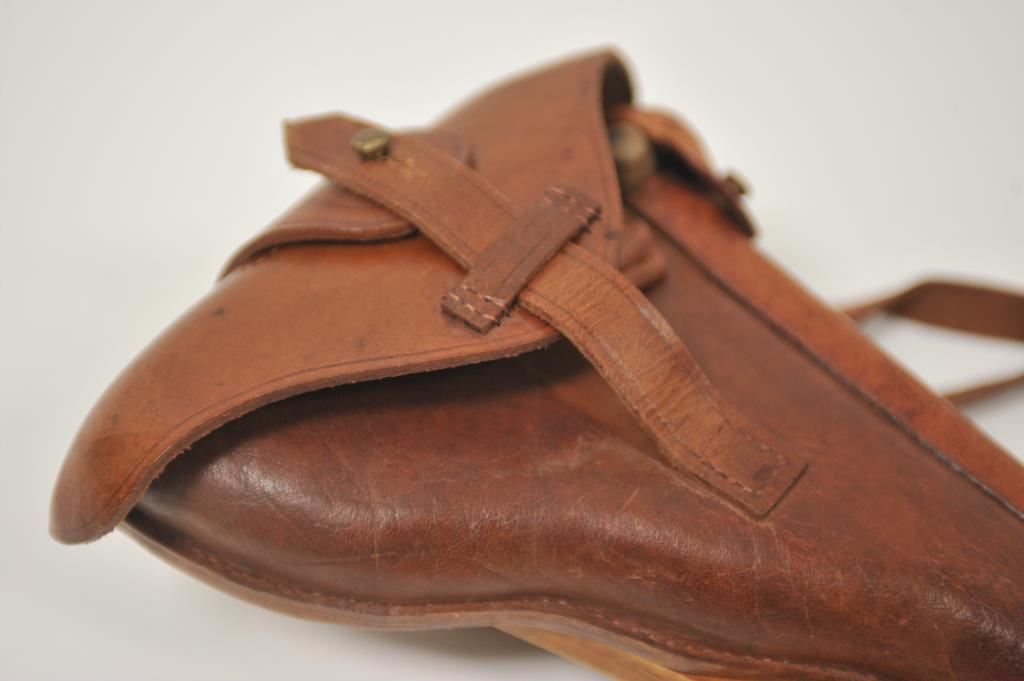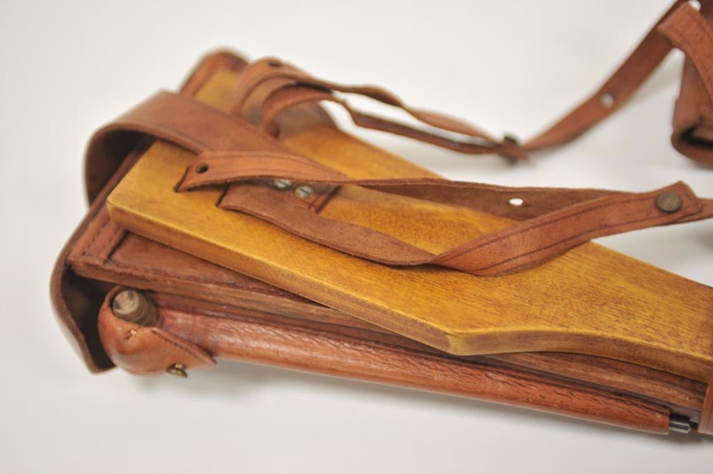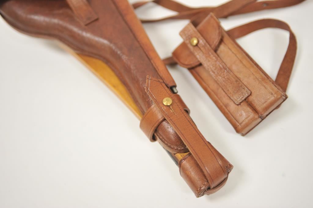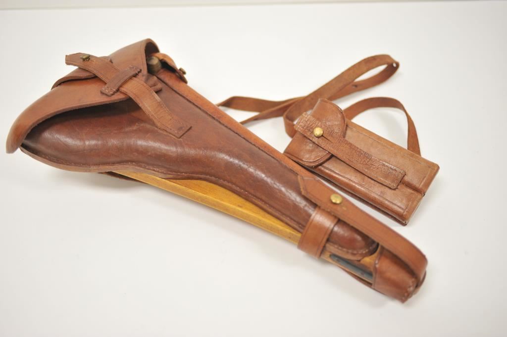 Reproduction wood shoulder stock, leather flap holster , leather carrier, strap and double magazine holder for an Artillery Luger semi-automatic pistol; overall very good condition with cleaning rod. Est.: $300-$600.