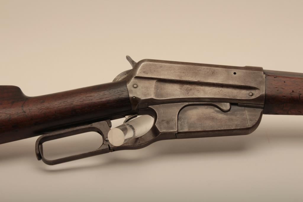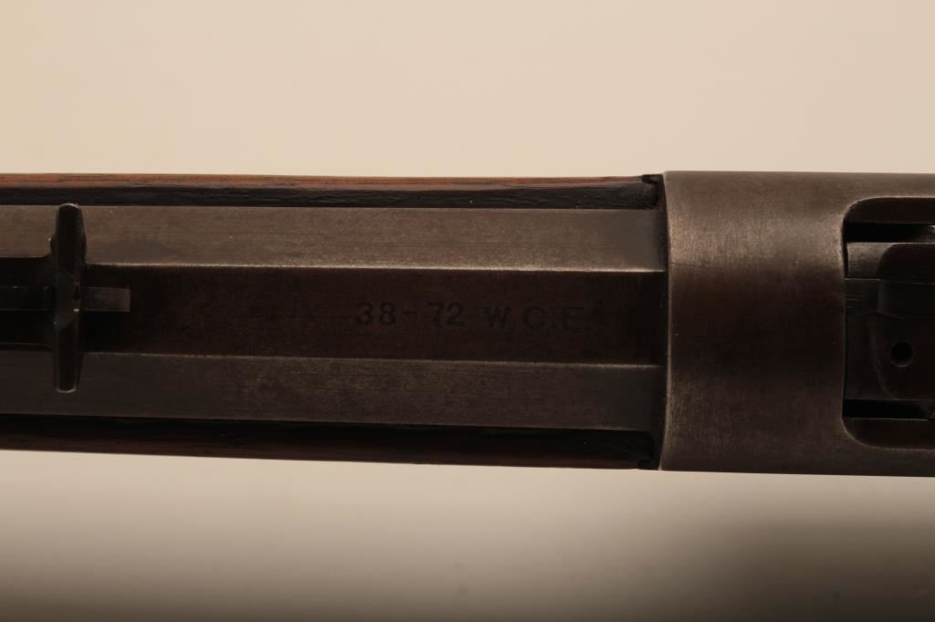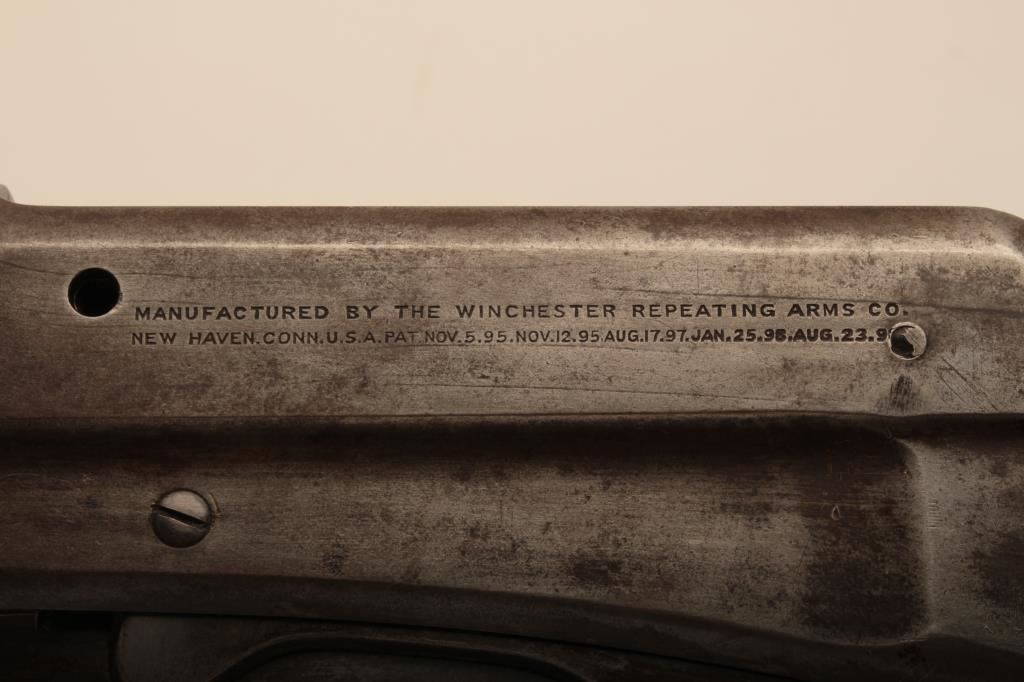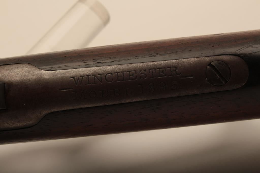 Winchester Model 1895 lever action rifle, .38-72 WCF caliber, Serial #31877. The rifle is in good overall condition with a 25” octagon barrel with a silver knife blade and standard rear sights. The barrel has gone primarily to a brown patina with traces of original blue in protected areas and some light surface erosion. The receiver is a grey/brown patina with old, muted case hardening evident in the trigger and hammer. The smooth wood stocks are in good condition with small mars and a 3” lateral crack on top of the fore end. The butt stock ends with a steel crescent butt plate. The bore is fair, the action functions and markings are sharp on this early Model 1895 manufactured in 1926. Est.: $900-$1,800. (C+R).