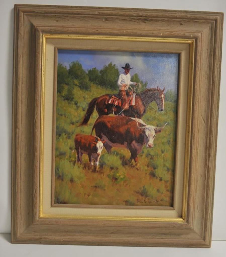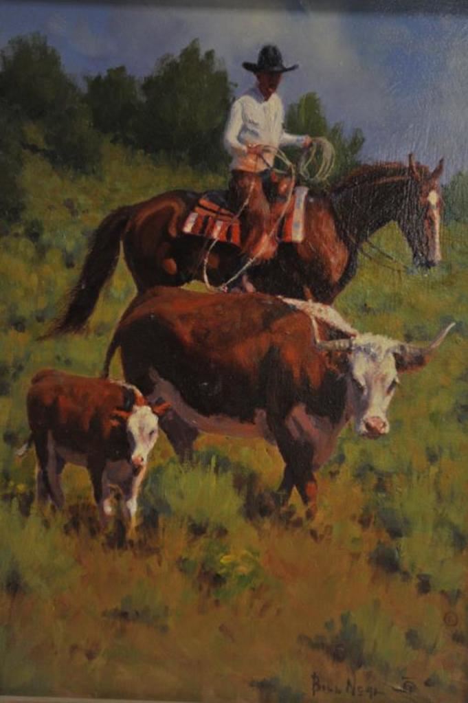 Framed oil on board of cowboy on horseback, steer and calf by Bill Neal (2005); approximately 22” x 19” overall; entitled “A Little Encouragement”. Est.: $750-$1,500.