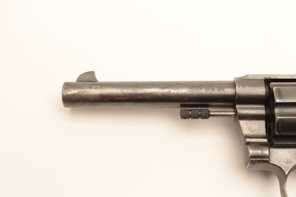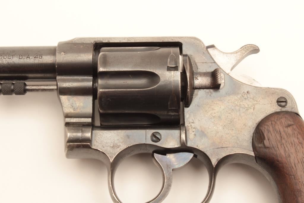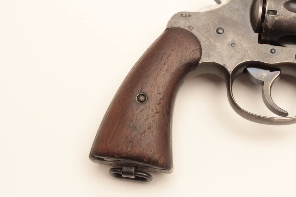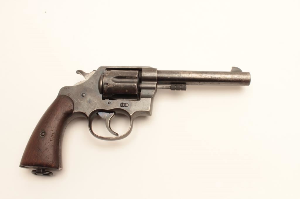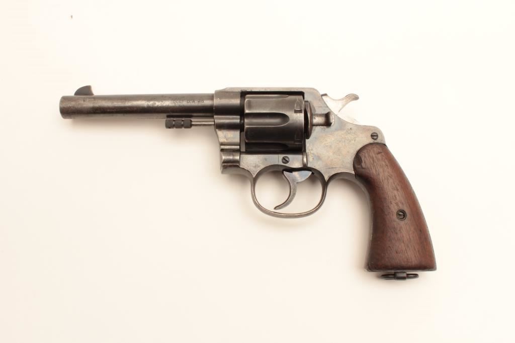 Colt 1909 Army double action revolver, .45 LC caliber, Serial #33384. The pistol is in good overall condition with a 5 ½” barrel. The metal surfaces retain the majority of their blued finish with moderate wear along the barrel and light surface erosion. The underside of the barrel is US property marked with the “RAC” inspector’s stamp on the barrel and frame. The smooth wood grips are in good condition with mars, compressions and a lanyard ring in the butt. The bore is good, the action crisp and markings are sharp. Est.: $800-$1,600. (C+R).