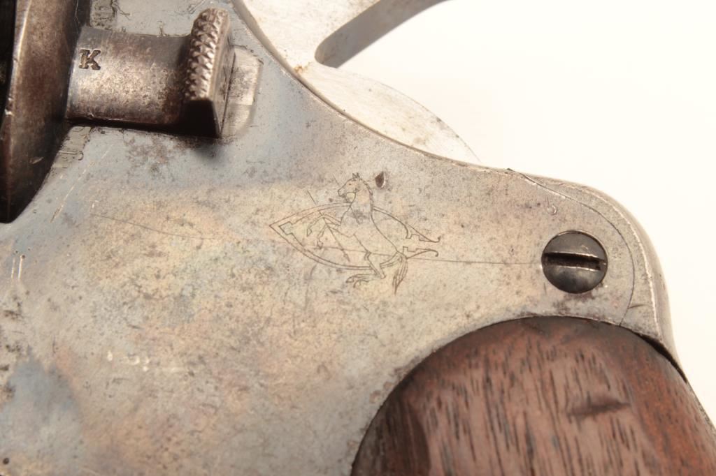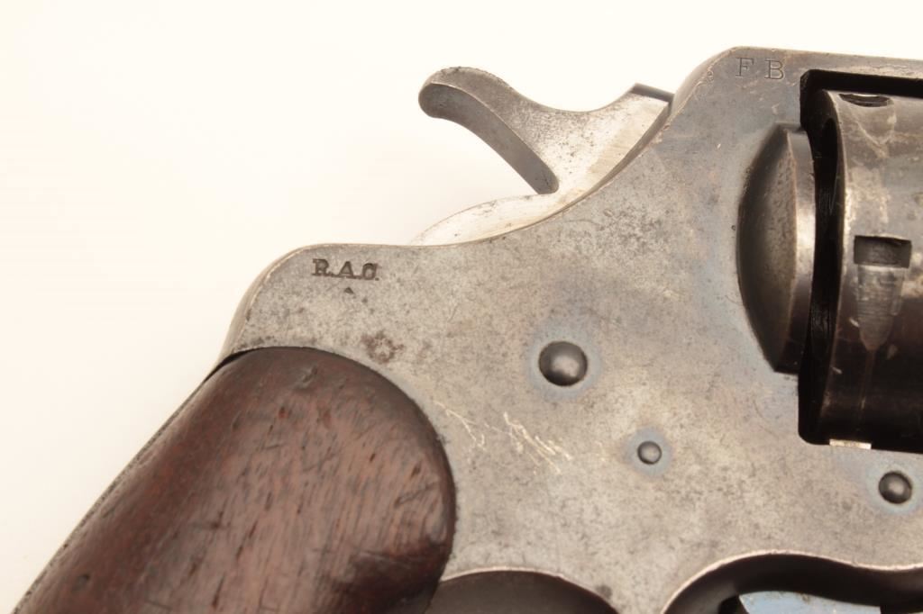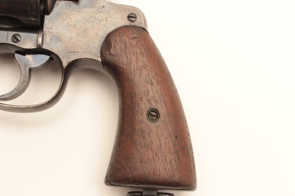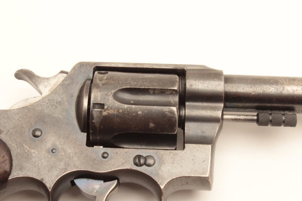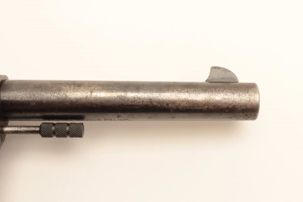 Colt 1909 Army double action revolver, .45 LC caliber, Serial #33384. The pistol is in good overall condition with a 5 ½” barrel. The metal surfaces retain the majority of their blued finish with moderate wear along the barrel and light surface erosion. The underside of the barrel is US property marked with the “RAC” inspector’s stamp on the barrel and frame. The smooth wood grips are in good condition with mars, compressions and a lanyard ring in the butt. The bore is good, the action crisp and markings are sharp. Est.: $800-$1,600. (C+R).