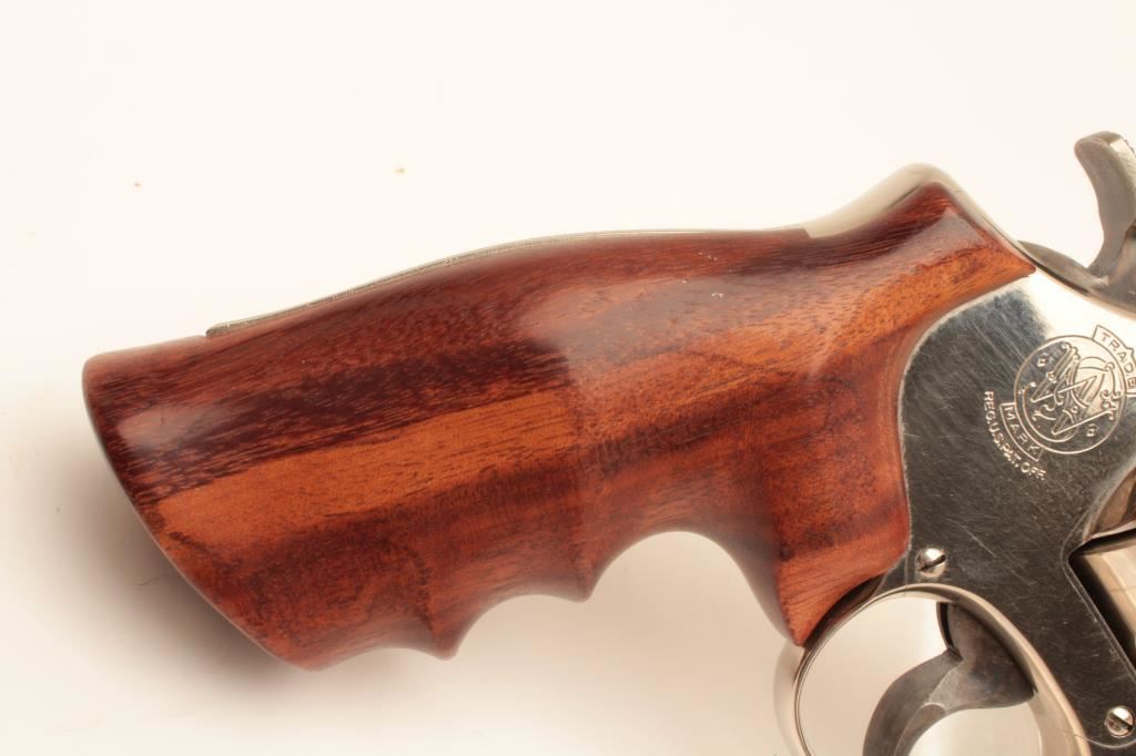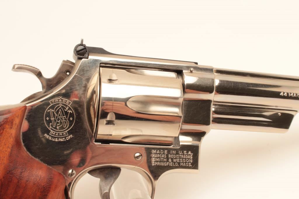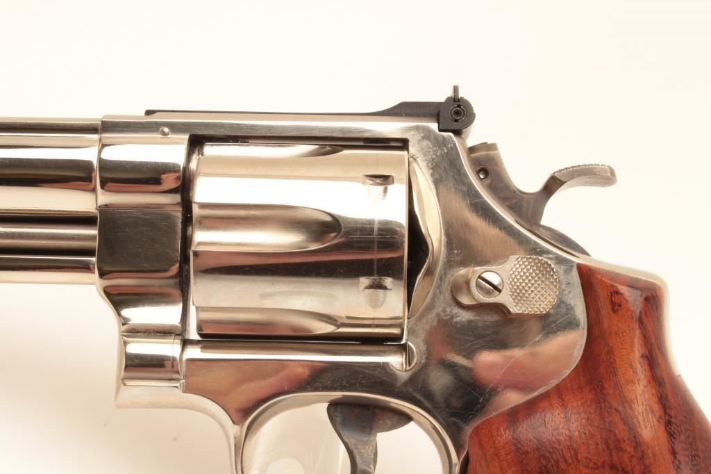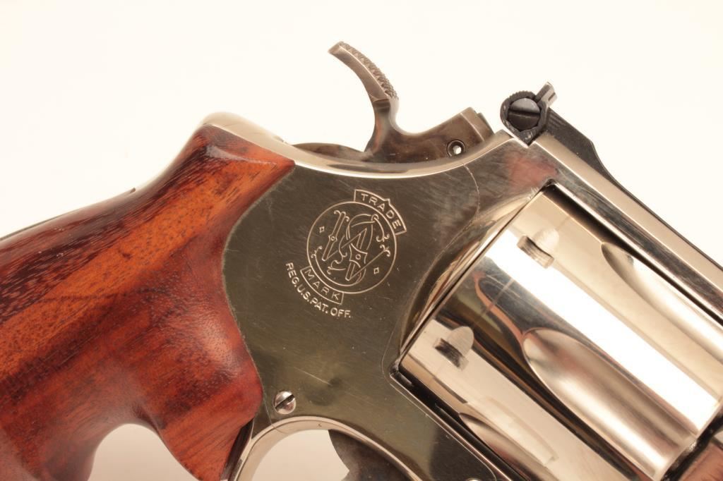 Smith & Wesson Model 29-2 revolver, .44 Magnum caliber, Serial #N487506. The pistol is in fine overall condition with an 8 3/8” barrel with a red ramp front and adjustable rear sights. The pistol retains nearly all of its polished nickel finish with only handling marks and a light drag line on the cylinder. The smooth wood combat style grips are in very good condition. The bore is very good, the action crisp and markings are sharp on this lightly used S&W. (No sales to California residents). Est.: $750-$1,500. (Modern).
