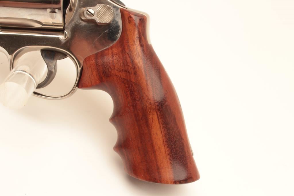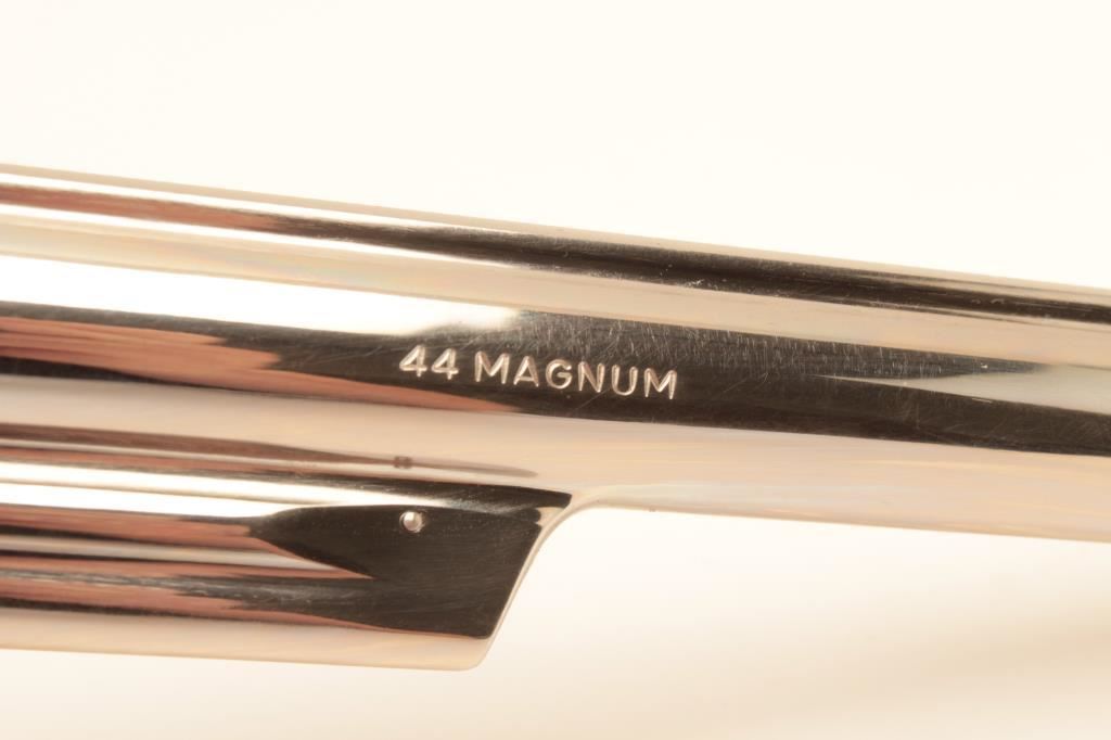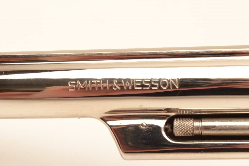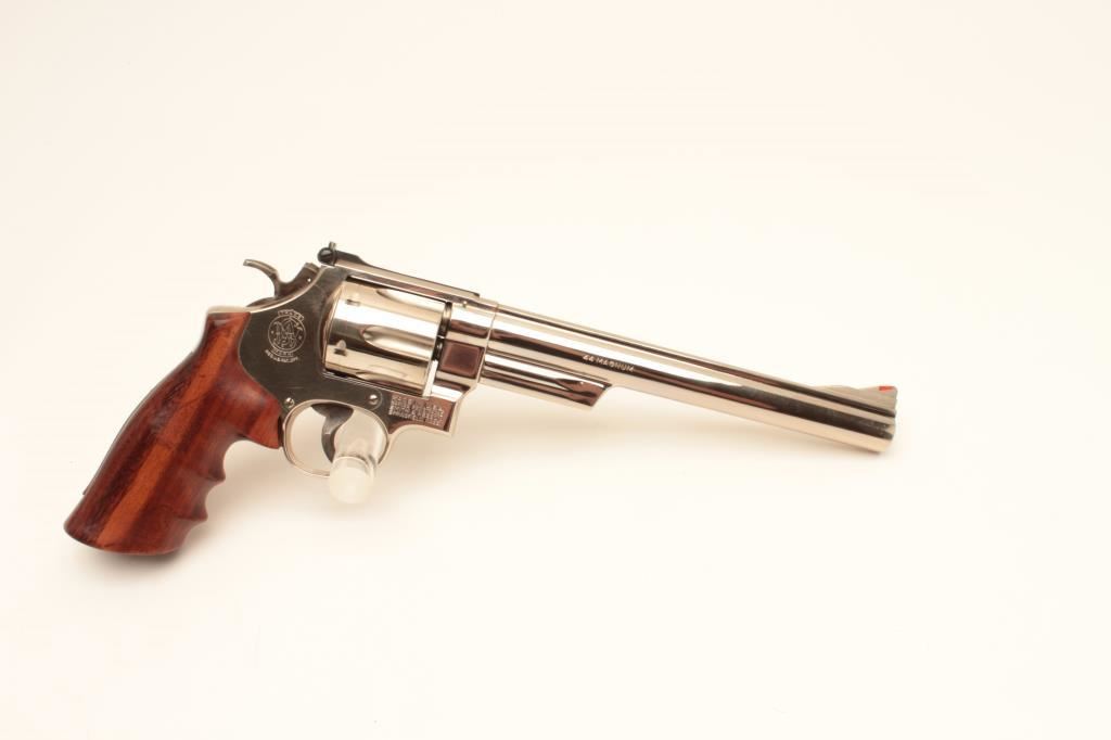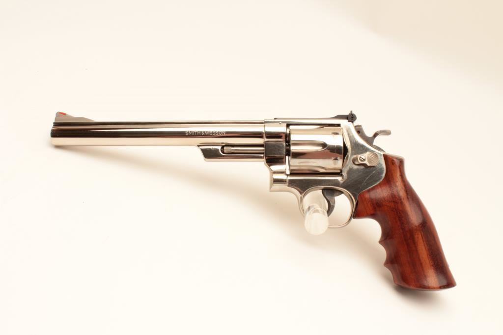 Smith & Wesson Model 29-2 revolver, .44 Magnum caliber, Serial #N487506. The pistol is in fine overall condition with an 8 3/8” barrel with a red ramp front and adjustable rear sights. The pistol retains nearly all of its polished nickel finish with only handling marks and a light drag line on the cylinder. The smooth wood combat style grips are in very good condition. The bore is very good, the action crisp and markings are sharp on this lightly used S&W. (No sales to California residents). Est.: $750-$1,500. (Modern).