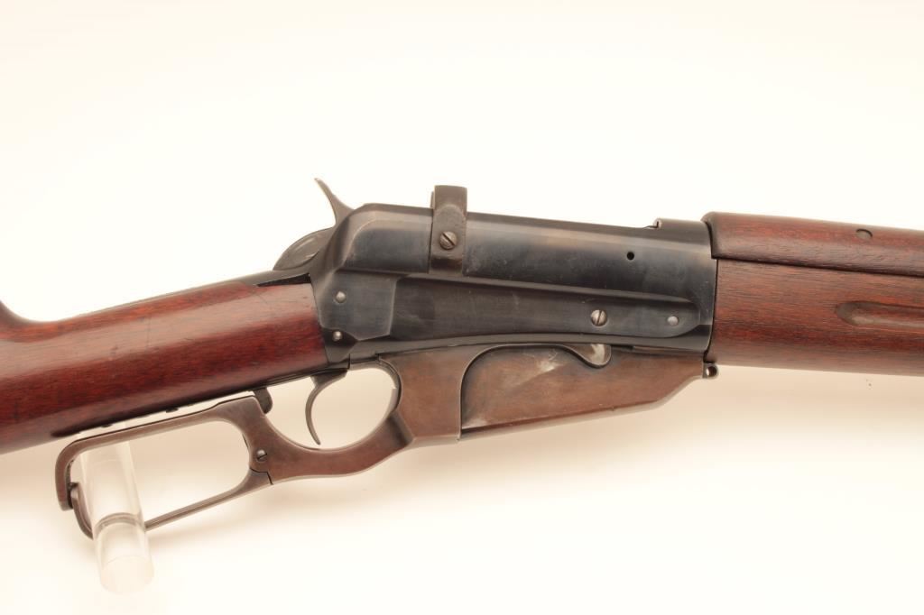 Winchester Model 1895 Russian lever action musket, 7.62 mm caliber, Serial #132818. The rifle is in fine overall condition with a 28” round barrel with a ramped blade front and military tangent style rear sights. The barrel retains a significant amount of blue finish as does the front barrel band. The receiver also retains nearly all of its blue finish with “Ears” or stripper clip guides still in place on top of the receiver and some thinning of finish on the lever assembly. The smooth wood full-length stocks are in very good condition with small compressions and a cartouche on the left side of the butt stock. The butt stock ends with a smooth, steel butt plate with trap. The rifle retains the sling swivels and bayonet lug. The bore is good, the action crisp and the markings are sharp on this nice musket manufactured in 1915. Est.: $750-$1,500. (C+R).
