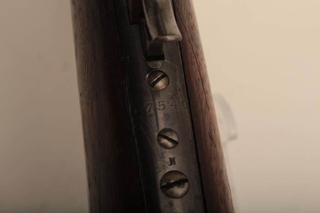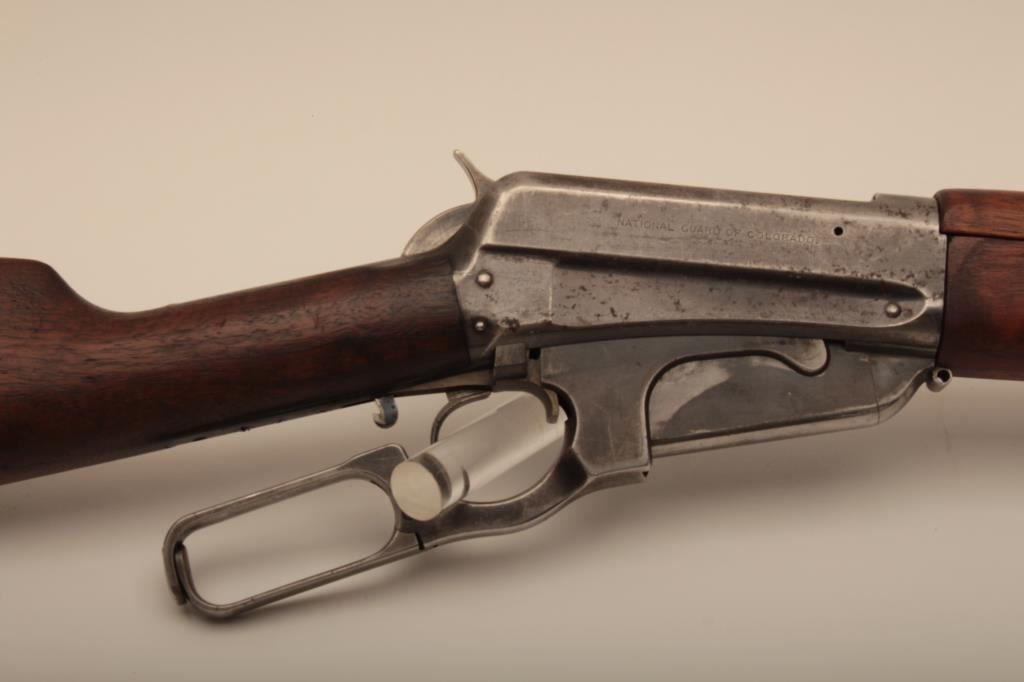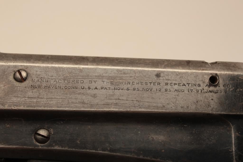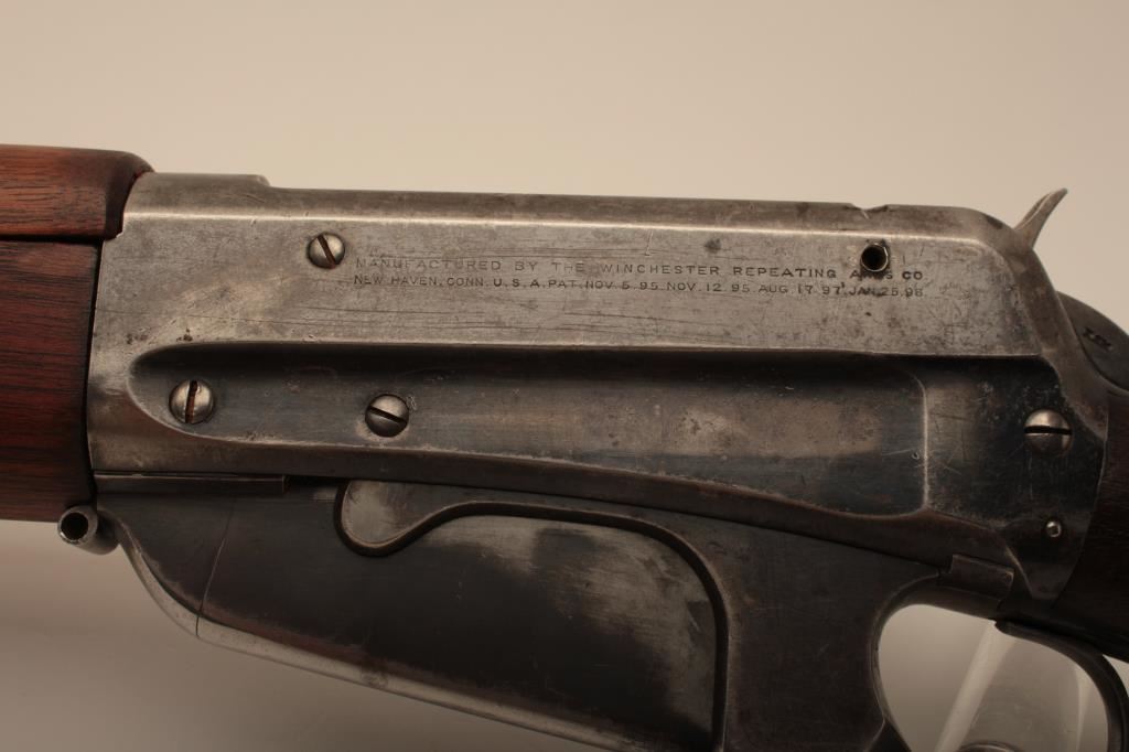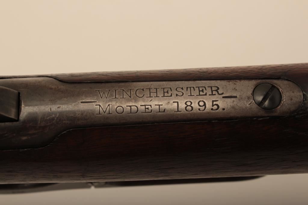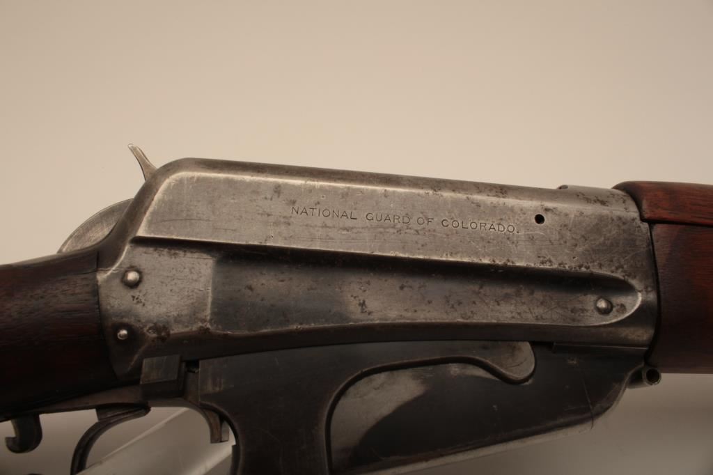 Winchester Model 1895 lever action musket, .30 Govt. caliber, Serial #17540. The rifle is in very good overall condition with a 27” round barrel with a ramped blade front and military tangent style rear sights. The barrel retains a significant amount of blue finish with areas of thinning and some small scratches. The receiver also retains a significant amount of its flaking blue finish with “NATIONAL GUARD OF COLORADO” stamped on the right side of the action and “2 E 31” on the front ring of the receiver. The smooth wood full-length stocks are in good condition with small compressions, mars and areas of oil soaking. The butt stock ends with a smooth, steel butt plate with trap. The rifle retains the sling swivels and bayonet lug. The bore is good, the action crisp and the markings are sharp on this musket that saw service with the Colorado National Guard manufactured in 1898. Est.: $700-$1,400. (Antique).