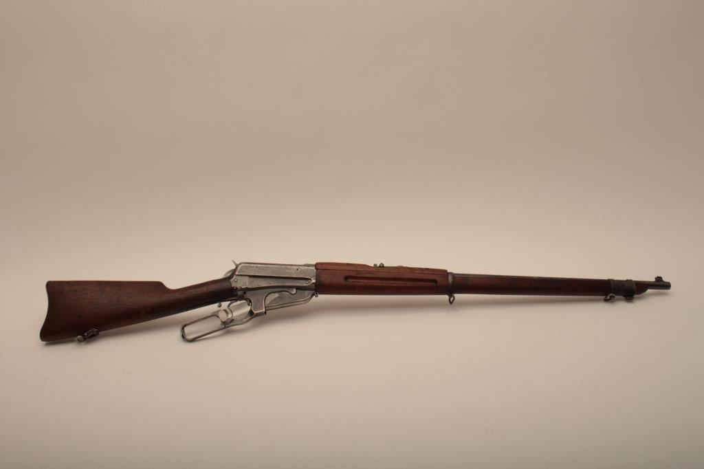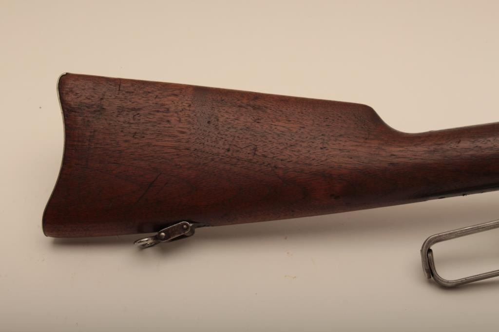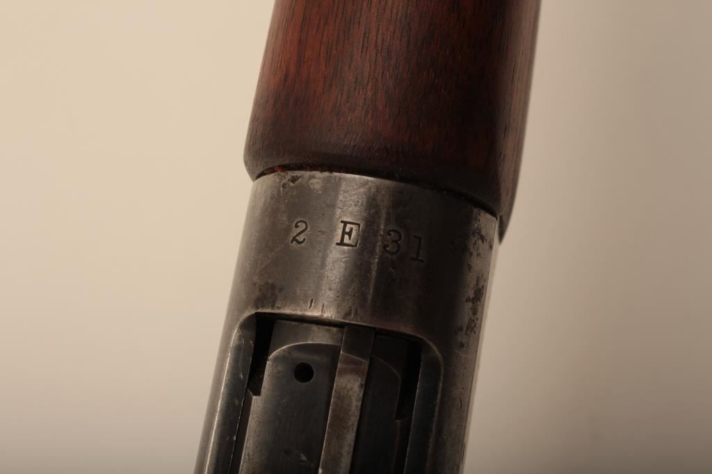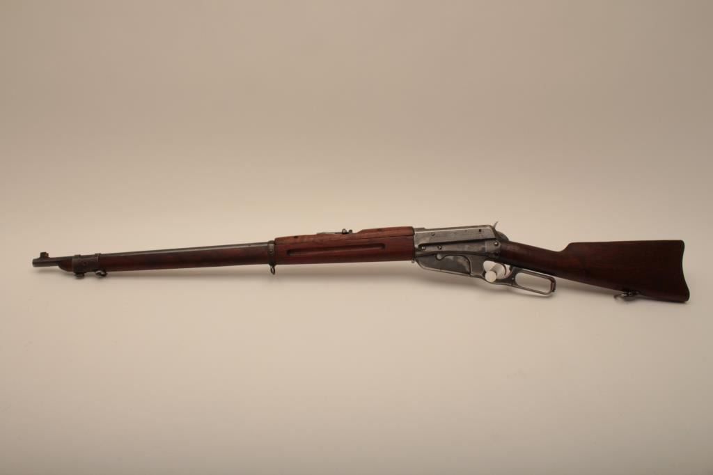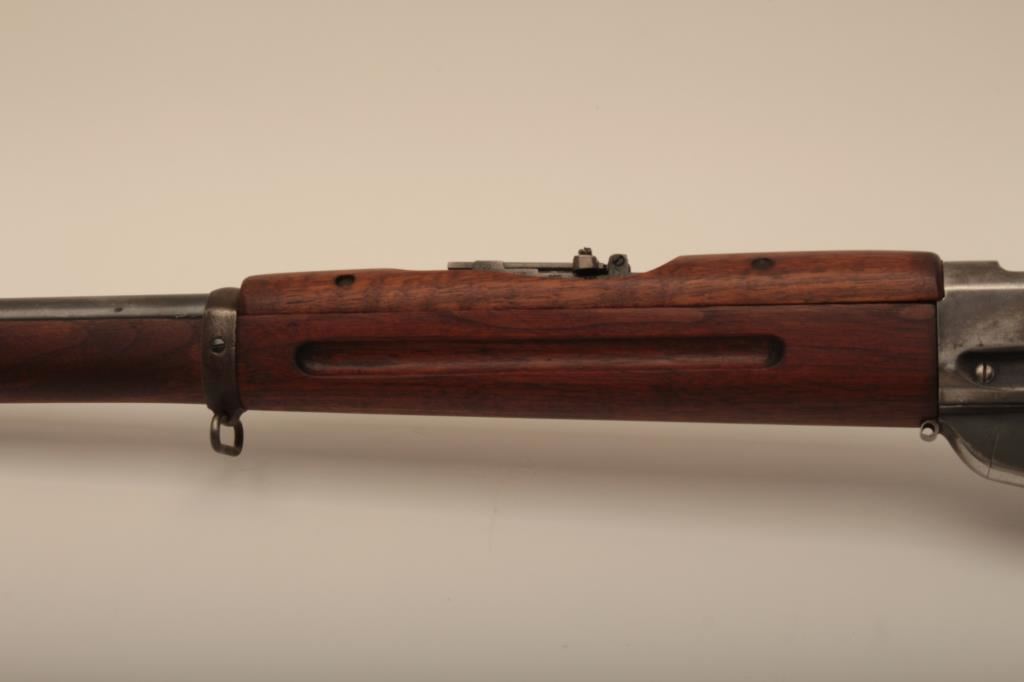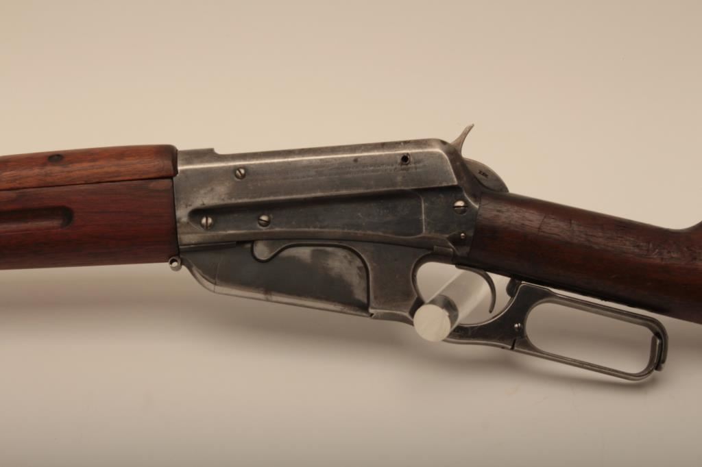 Winchester Model 1895 lever action musket, .30 Govt. caliber, Serial #17540. The rifle is in very good overall condition with a 27” round barrel with a ramped blade front and military tangent style rear sights. The barrel retains a significant amount of blue finish with areas of thinning and some small scratches. The receiver also retains a significant amount of its flaking blue finish with “NATIONAL GUARD OF COLORADO” stamped on the right side of the action and “2 E 31” on the front ring of the receiver. The smooth wood full-length stocks are in good condition with small compressions, mars and areas of oil soaking. The butt stock ends with a smooth, steel butt plate with trap. The rifle retains the sling swivels and bayonet lug. The bore is good, the action crisp and the markings are sharp on this musket that saw service with the Colorado National Guard manufactured in 1898. Est.: $700-$1,400. (Antique).