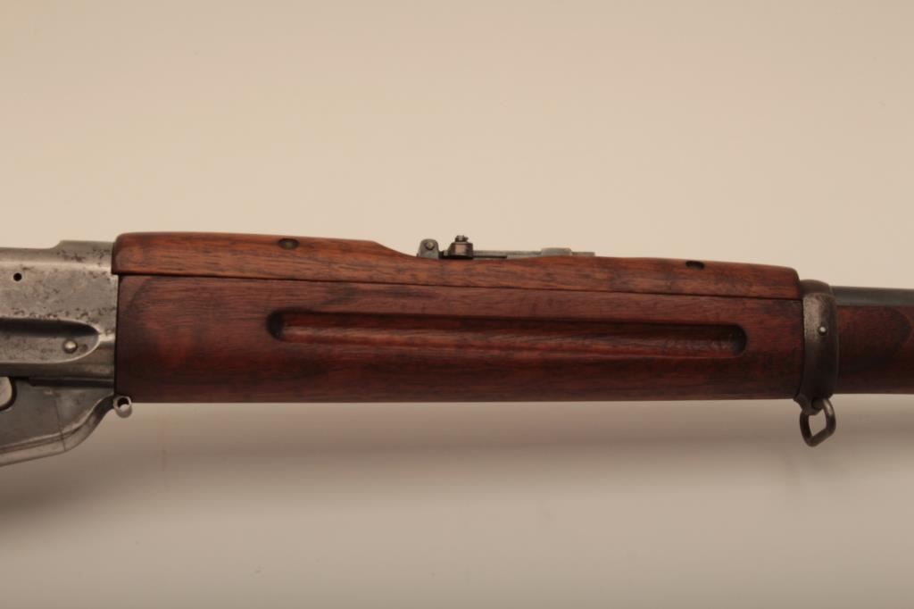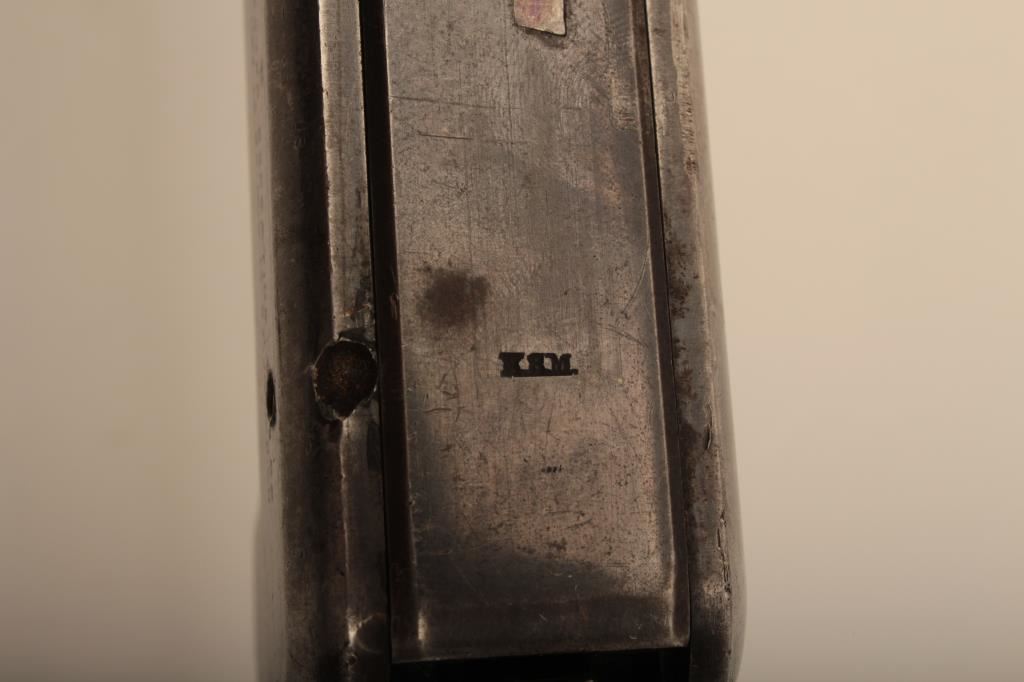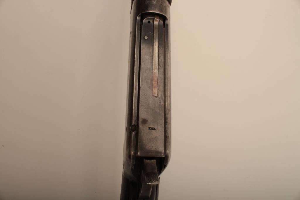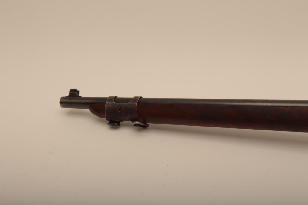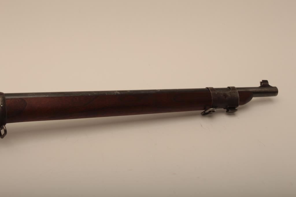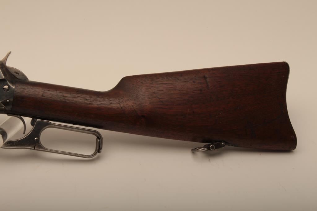 Winchester Model 1895 lever action musket, .30 Govt. caliber, Serial #17540. The rifle is in very good overall condition with a 27” round barrel with a ramped blade front and military tangent style rear sights. The barrel retains a significant amount of blue finish with areas of thinning and some small scratches. The receiver also retains a significant amount of its flaking blue finish with “NATIONAL GUARD OF COLORADO” stamped on the right side of the action and “2 E 31” on the front ring of the receiver. The smooth wood full-length stocks are in good condition with small compressions, mars and areas of oil soaking. The butt stock ends with a smooth, steel butt plate with trap. The rifle retains the sling swivels and bayonet lug. The bore is good, the action crisp and the markings are sharp on this musket that saw service with the Colorado National Guard manufactured in 1898. Est.: $700-$1,400. (Antique).