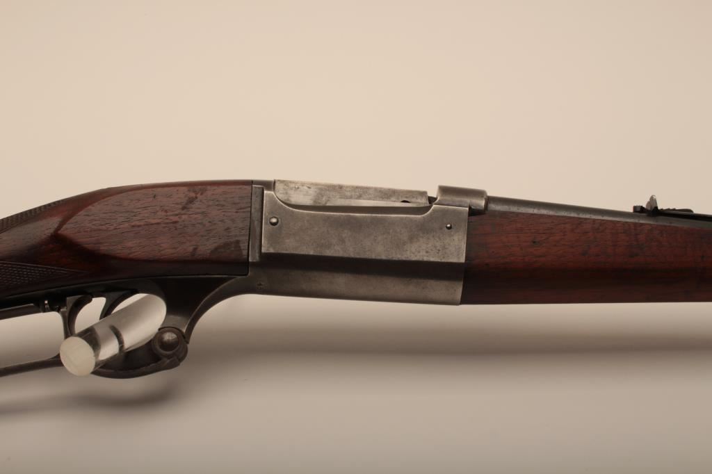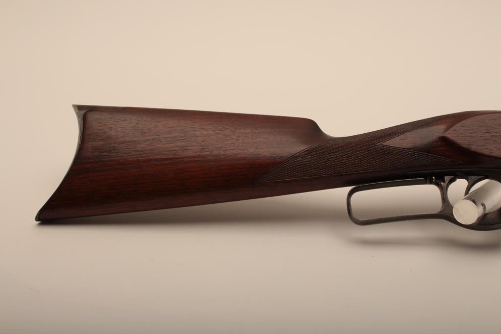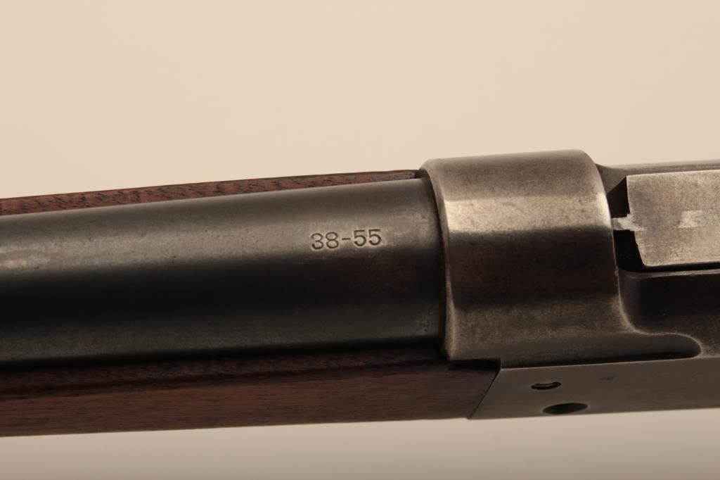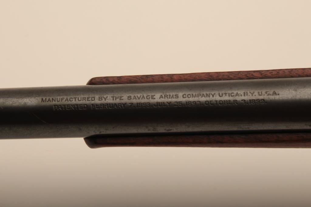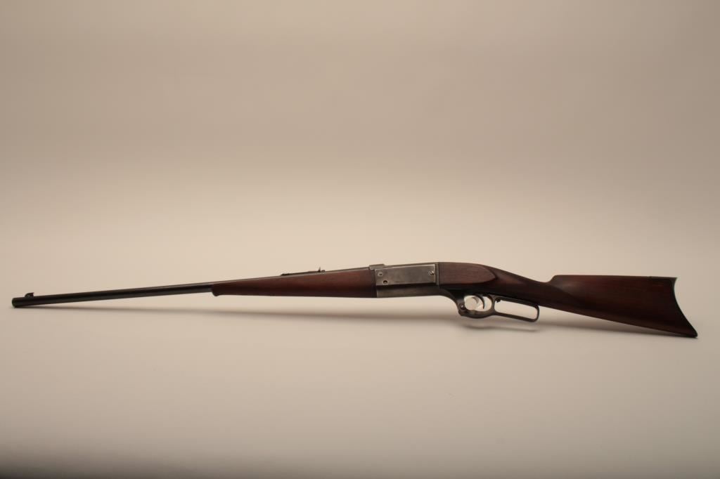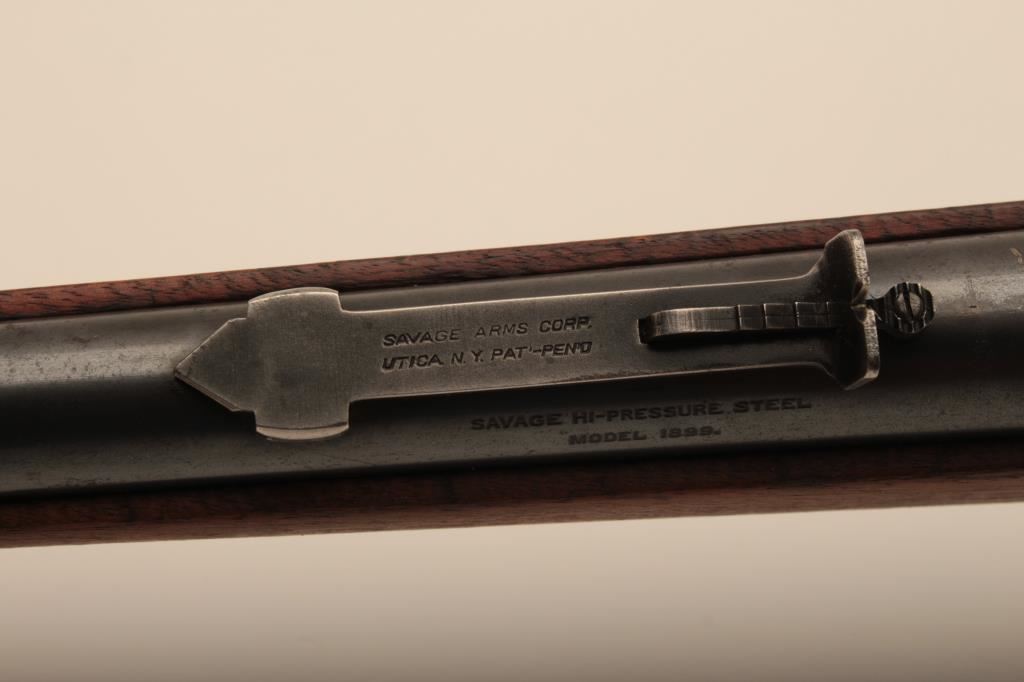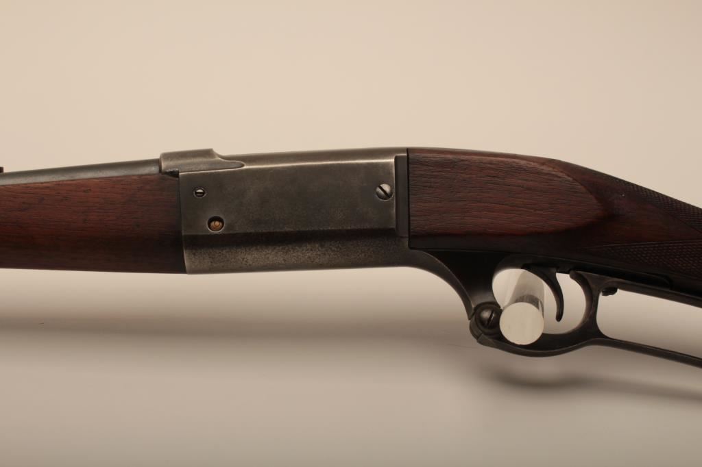 Savage Model 1899 lever action rifle, .38-55 caliber, Serial #45572. The rifle is in very good overall condition with a 26” round barrel with a ramped blade front sight and standard rear sight. The barrel retains the majority of its blue finish with light wear at the muzzle and some small scratches. The receiver shows original blue in the protected areas and at the rear of the tang, while the remainder is going to a grey patina. The rifle features the brass shell counter and shows muted case hardening on the lever, particularly on the protected portion of the assembly. The checkered wood stocks are in good condition with some oil staining and small mars. The butt stock ends with a smooth, steel butt plate. The bore is good, the action is crisp and markings are sharp on this Model 99 desirable in this chambering, manufactured in 1905. Est.: $600-$1,200. (C+R).