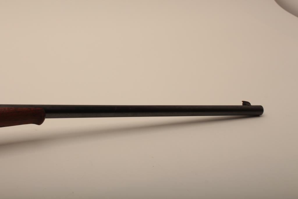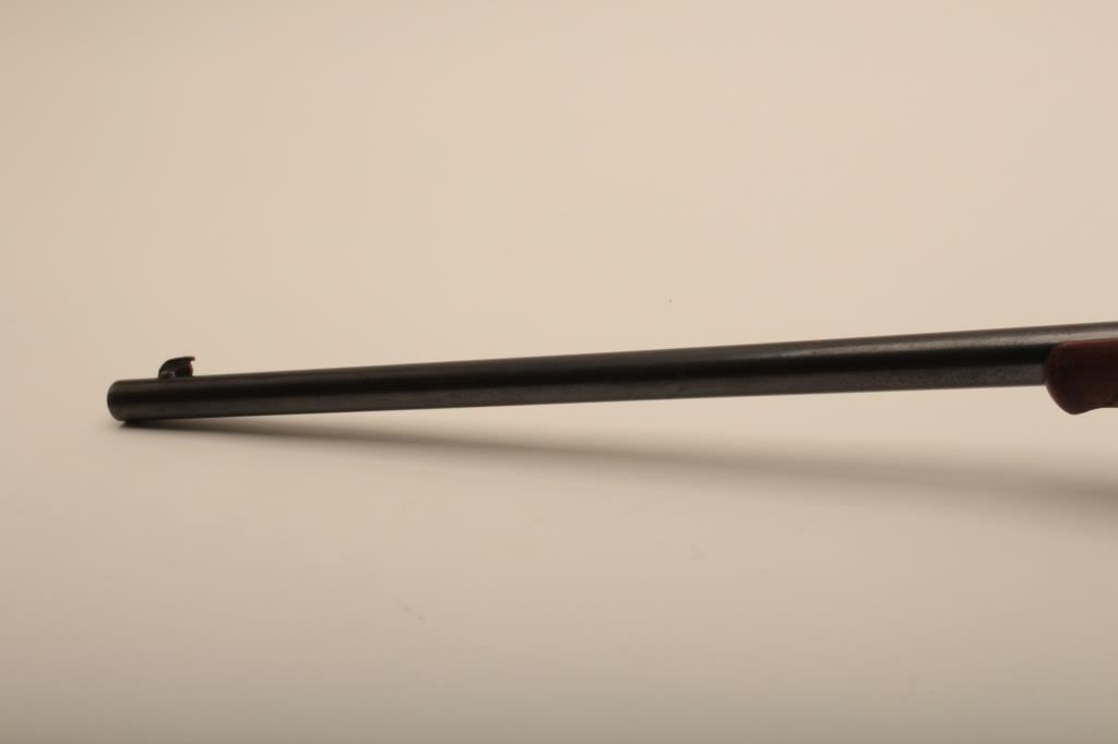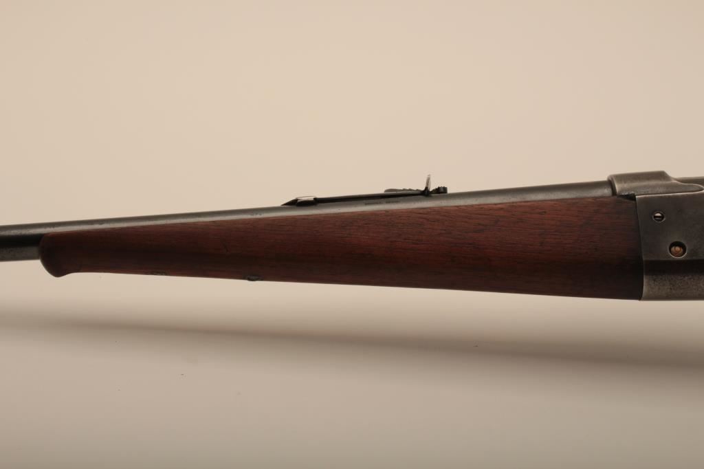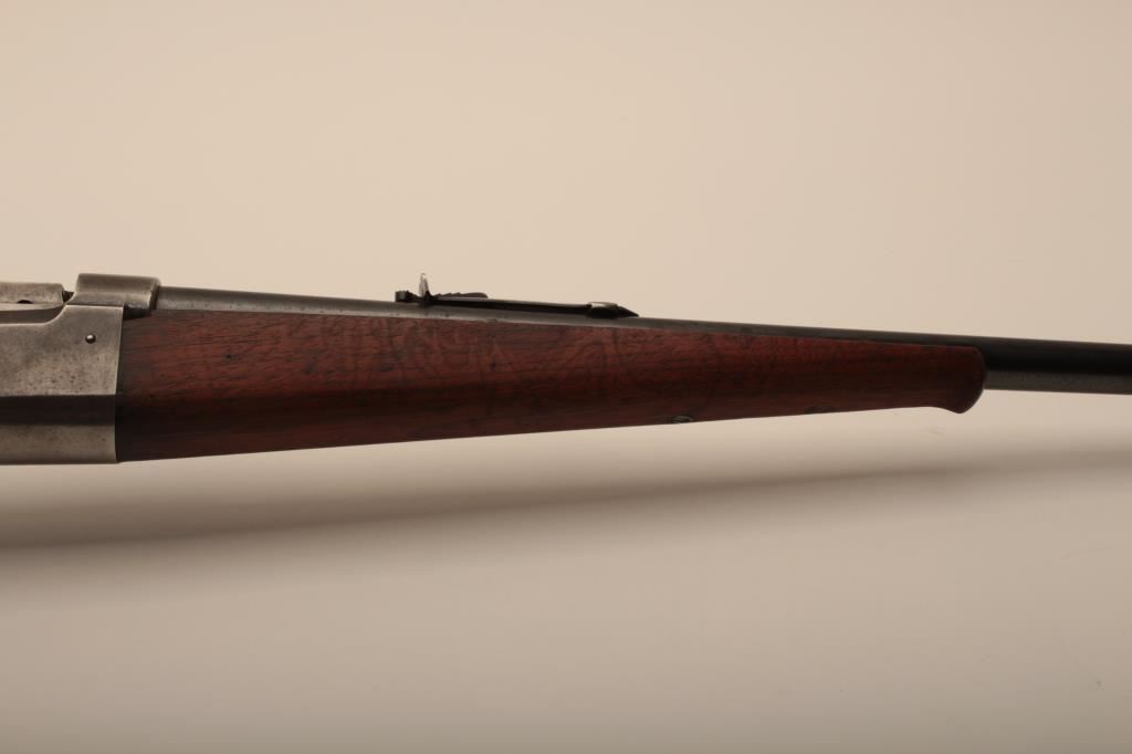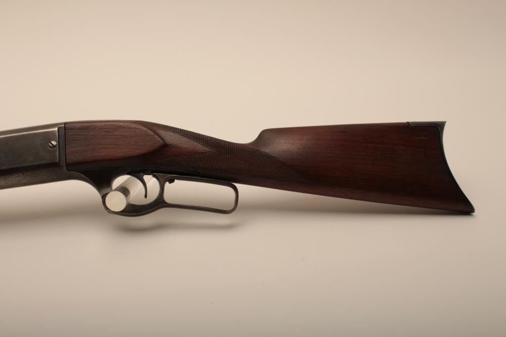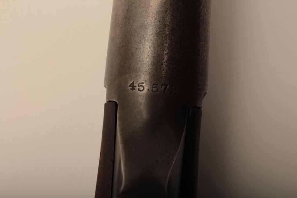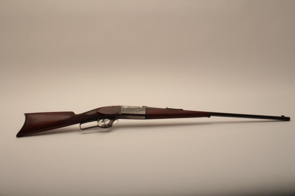 Savage Model 1899 lever action rifle, .38-55 caliber, Serial #45572. The rifle is in very good overall condition with a 26” round barrel with a ramped blade front sight and standard rear sight. The barrel retains the majority of its blue finish with light wear at the muzzle and some small scratches. The receiver shows original blue in the protected areas and at the rear of the tang, while the remainder is going to a grey patina. The rifle features the brass shell counter and shows muted case hardening on the lever, particularly on the protected portion of the assembly. The checkered wood stocks are in good condition with some oil staining and small mars. The butt stock ends with a smooth, steel butt plate. The bore is good, the action is crisp and markings are sharp on this Model 99 desirable in this chambering, manufactured in 1905. Est.: $600-$1,200. (C+R).