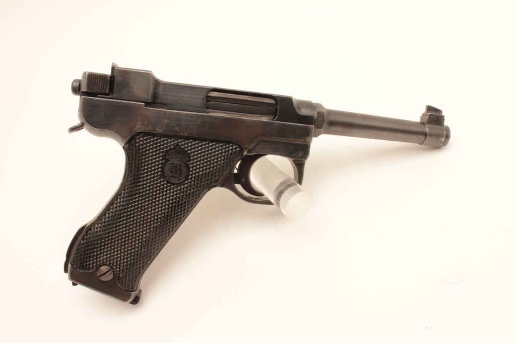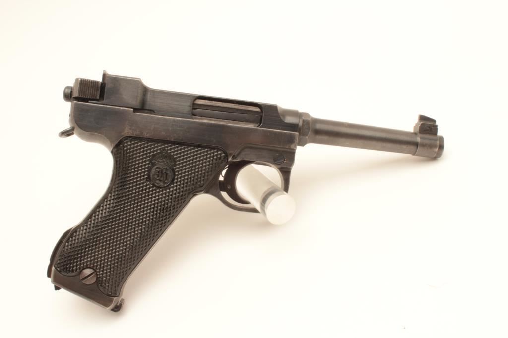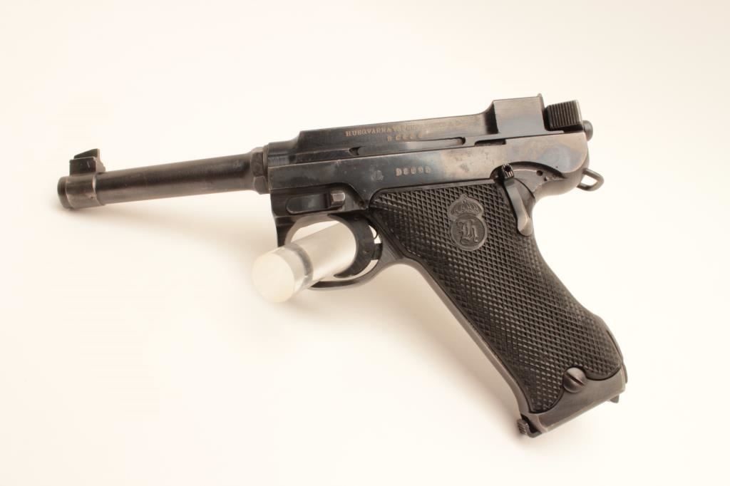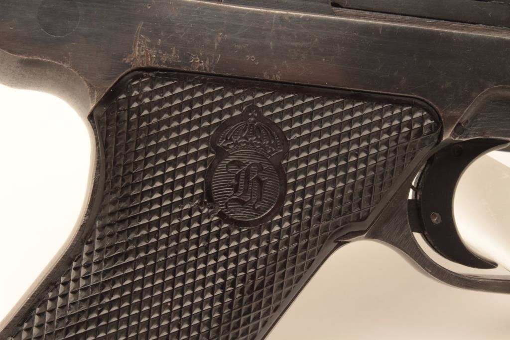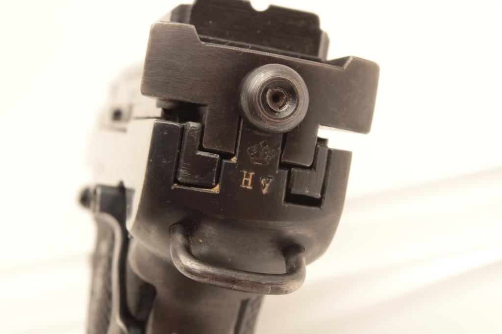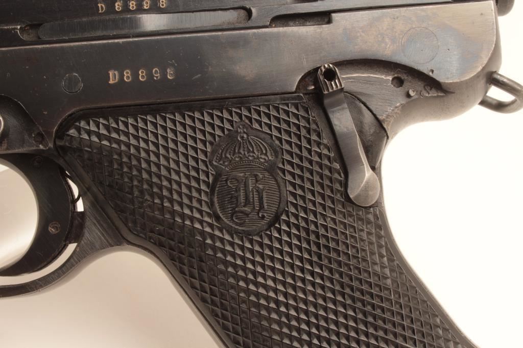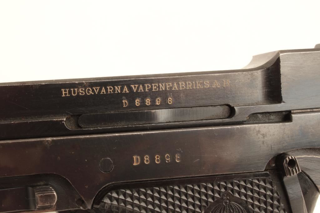 Husqvarna Model 40 Lahti semi-automatic pistol, 9mm caliber, Serial #D8898. The pistol is in very good overall condition with a 4 ¾” barrel. The pistol retains the majority of its thinning blue finish with holster wear at the muzzle, high point edge wear and small scratches to the finish. The checkered plastic grips are in good condition showing moderate wear from carry and use. The bore is good, the action is crisp and markings are sharp on this desirable pistol. Est.: $600-$1,200. (C+R).