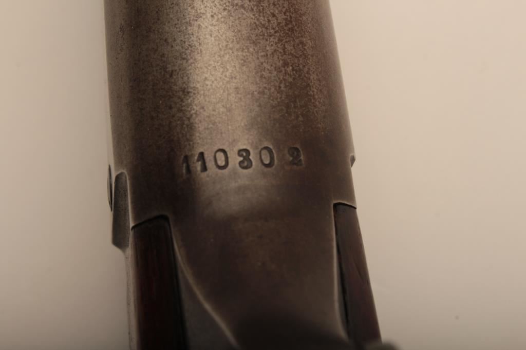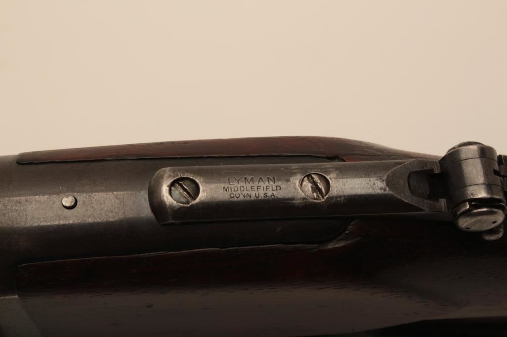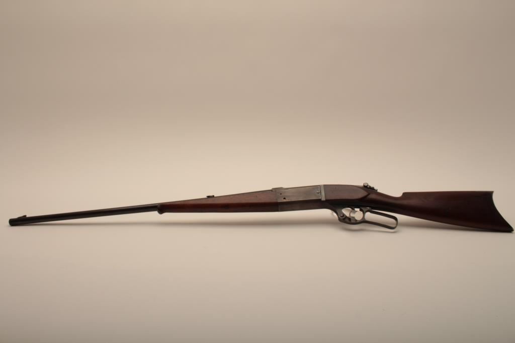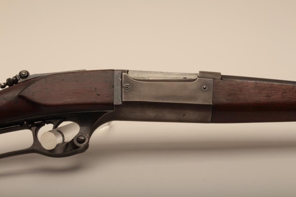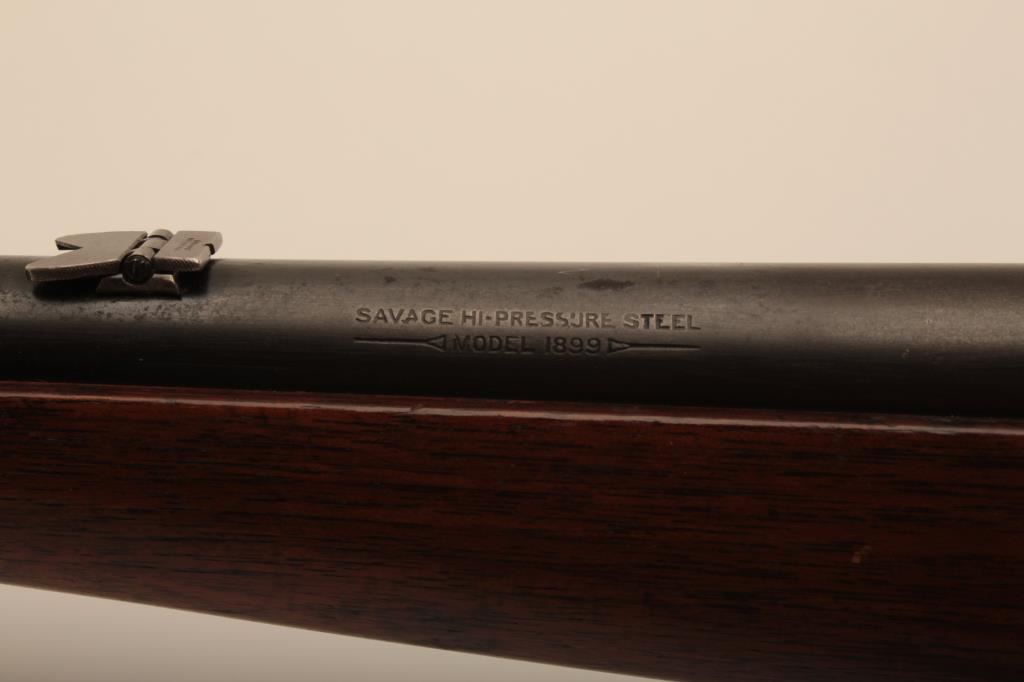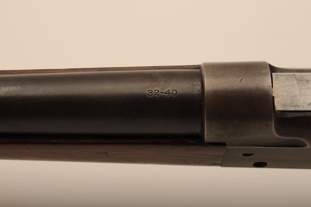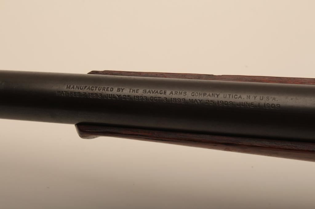 Savage Model 1899 lever action rifle, .32-40 caliber, Serial #110302. The rifle is in very good overall condition with a 26” round barrel with a silver knife blade front sight and two-leaf folding rear sight. The barrel retains a significant amount of its thinning blue finish with wear at the muzzle and some light surface erosion. The receiver shows original blue in the protected areas and at the rear of the tang, while the remainder is going to a grey patina. The rifle features the brass shell counter and shows old, toned case hardening on the lever, particularly on the protected portion of the assembly. A period Lyman tang sight has been added during the period of use. The smooth wood stocks are in good condition with mars and dents consistent with field use. The butt stock ends with a smooth, steel butt plate. The bore is good, the action is crisp and markings are sharp on this early Savage 1899, manufactured in 1911. Est.: $500-$1,000. (C+R).