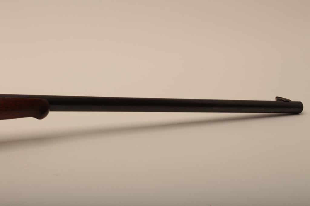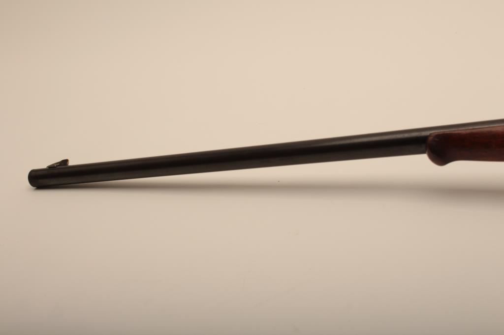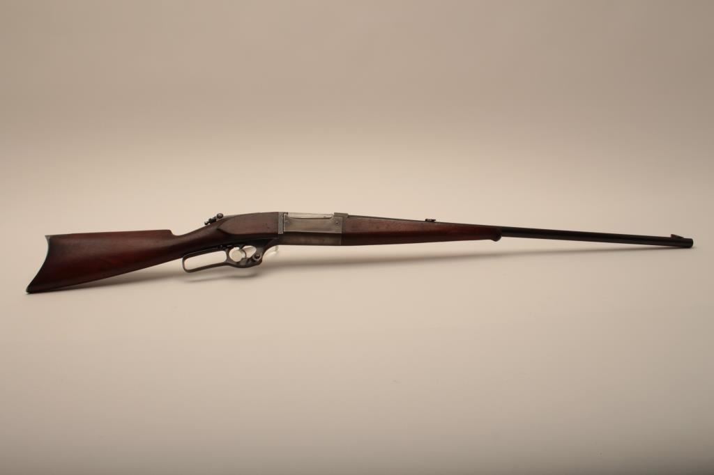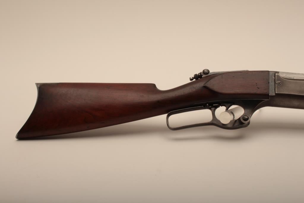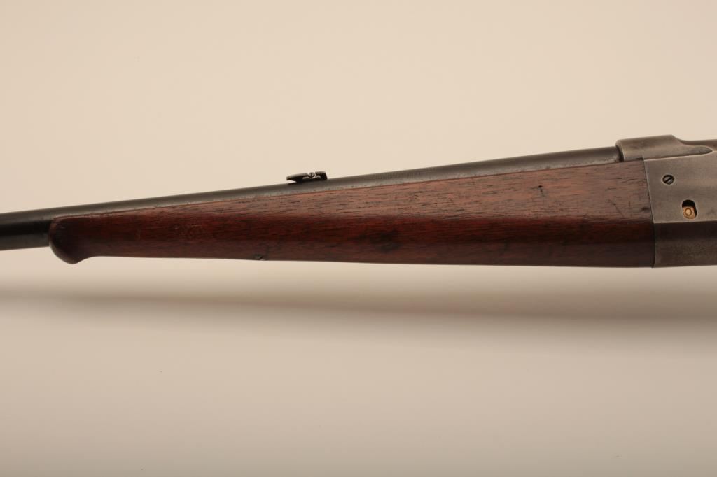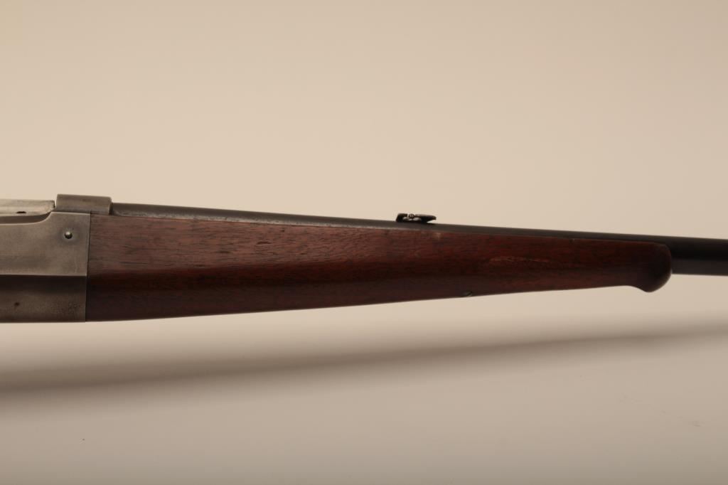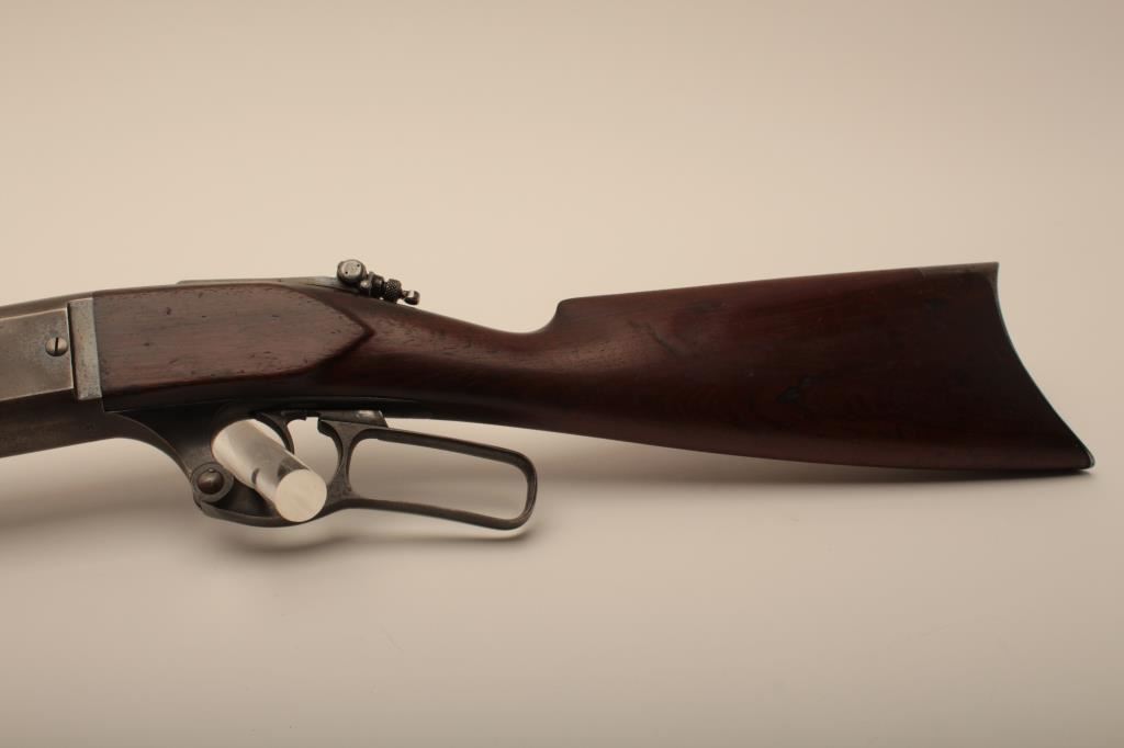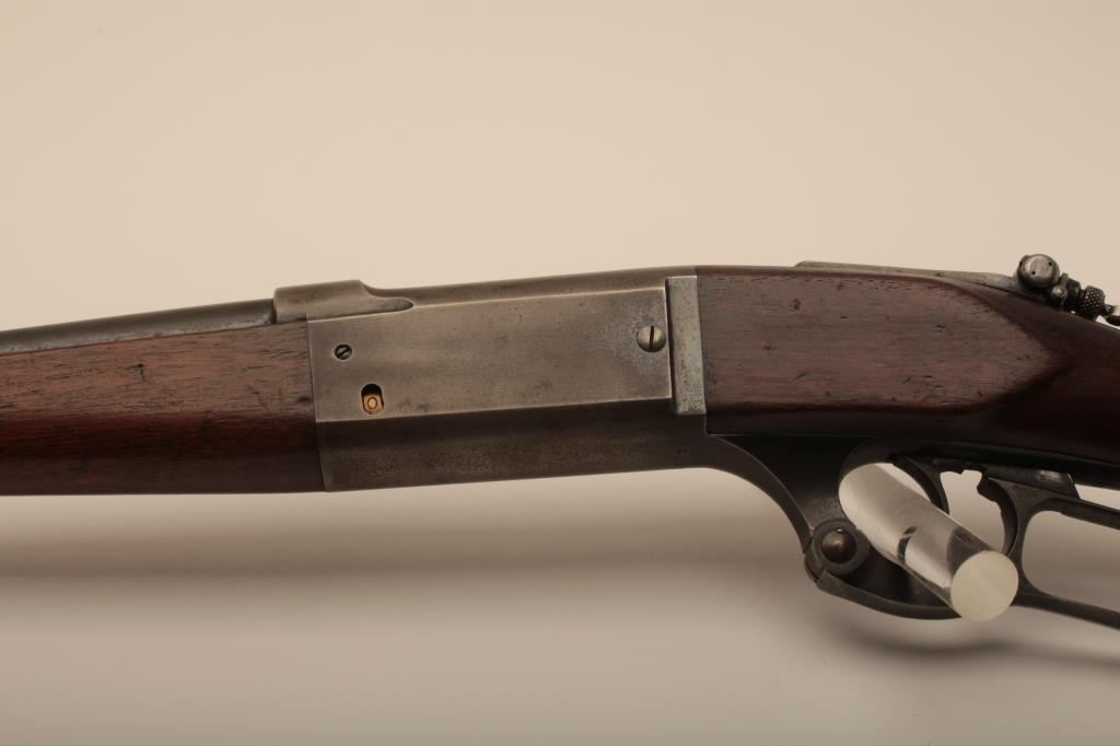 Savage Model 1899 lever action rifle, .32-40 caliber, Serial #110302. The rifle is in very good overall condition with a 26” round barrel with a silver knife blade front sight and two-leaf folding rear sight. The barrel retains a significant amount of its thinning blue finish with wear at the muzzle and some light surface erosion. The receiver shows original blue in the protected areas and at the rear of the tang, while the remainder is going to a grey patina. The rifle features the brass shell counter and shows old, toned case hardening on the lever, particularly on the protected portion of the assembly. A period Lyman tang sight has been added during the period of use. The smooth wood stocks are in good condition with mars and dents consistent with field use. The butt stock ends with a smooth, steel butt plate. The bore is good, the action is crisp and markings are sharp on this early Savage 1899, manufactured in 1911. Est.: $500-$1,000. (C+R).