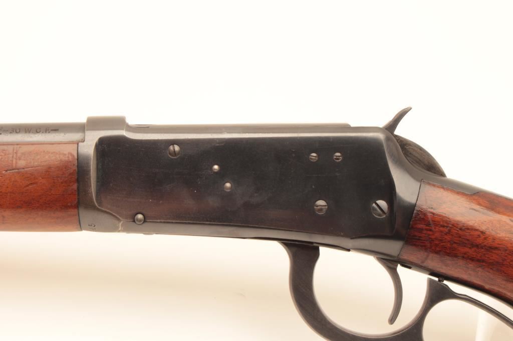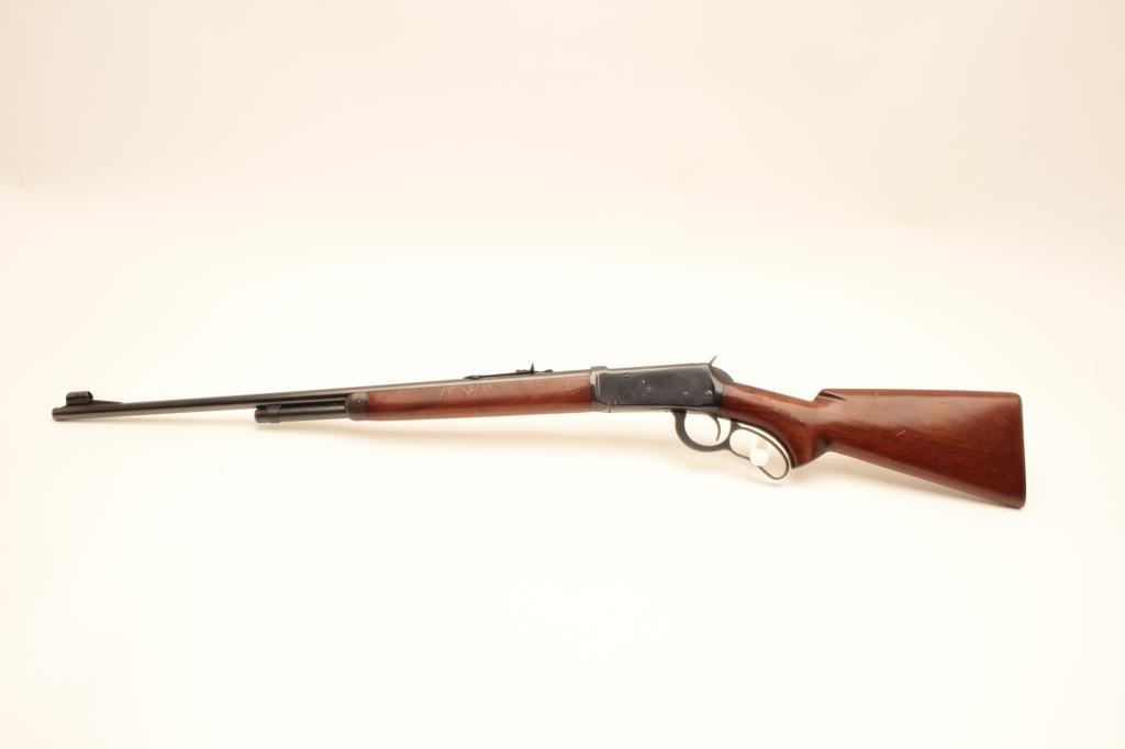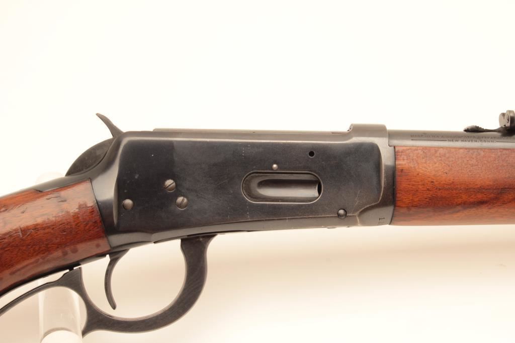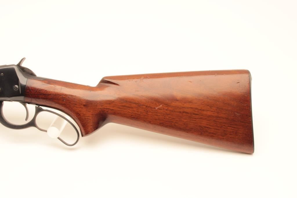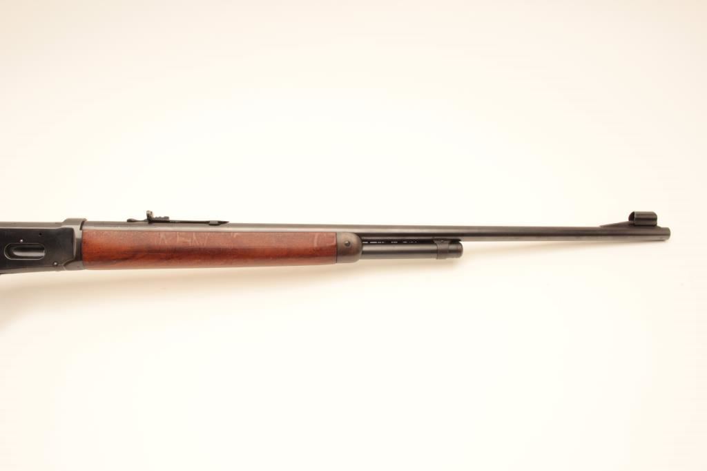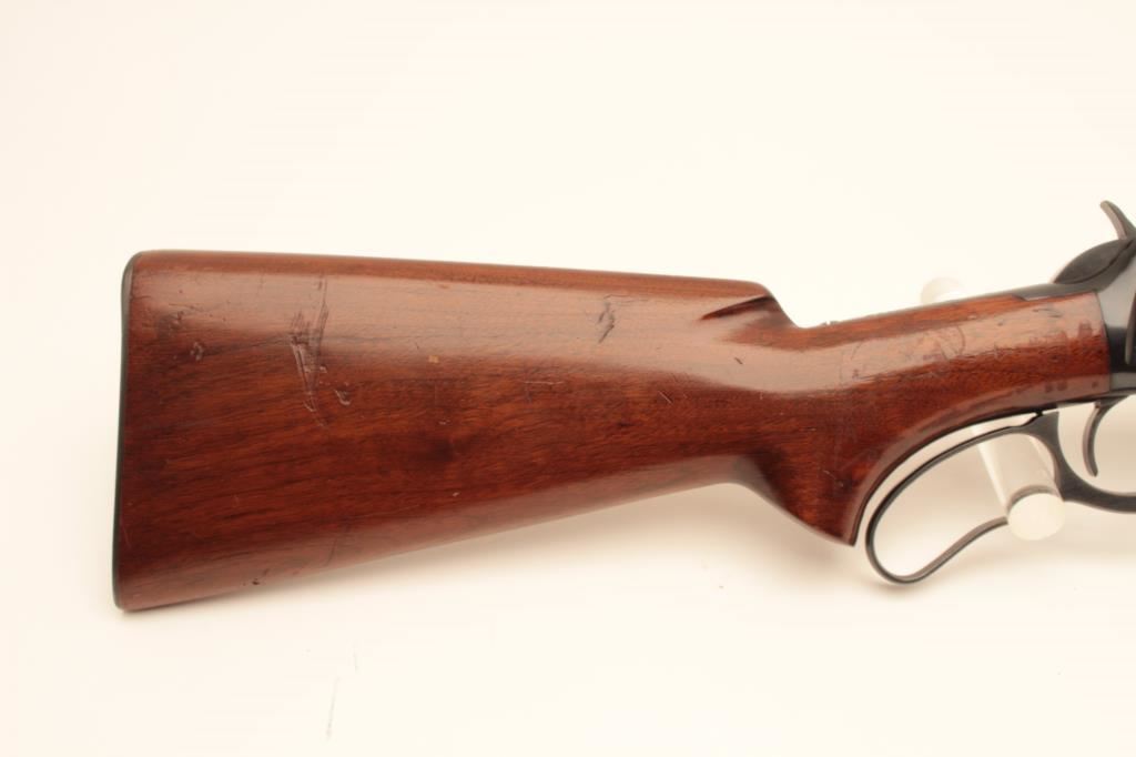 Winchester Model 64 lever action rifle, .30 WCF caliber, Serial #1224445. The rifle is in very good overall condition with a 24” barrel with a hooded front and standard rear sights. The barrel and half-magazine both retain the majority of their blue finish with light wear at the muzzle and small handling marks. The smooth wood stocks are in good condition with mars and compressions consistent with field use. The butt stock ends with a checkered steel butt plate. The bore is good, the markings are sharp and the action is crisp. Est.: $500-$1,000. (C+R).