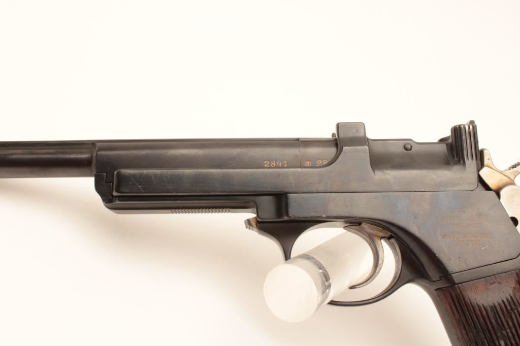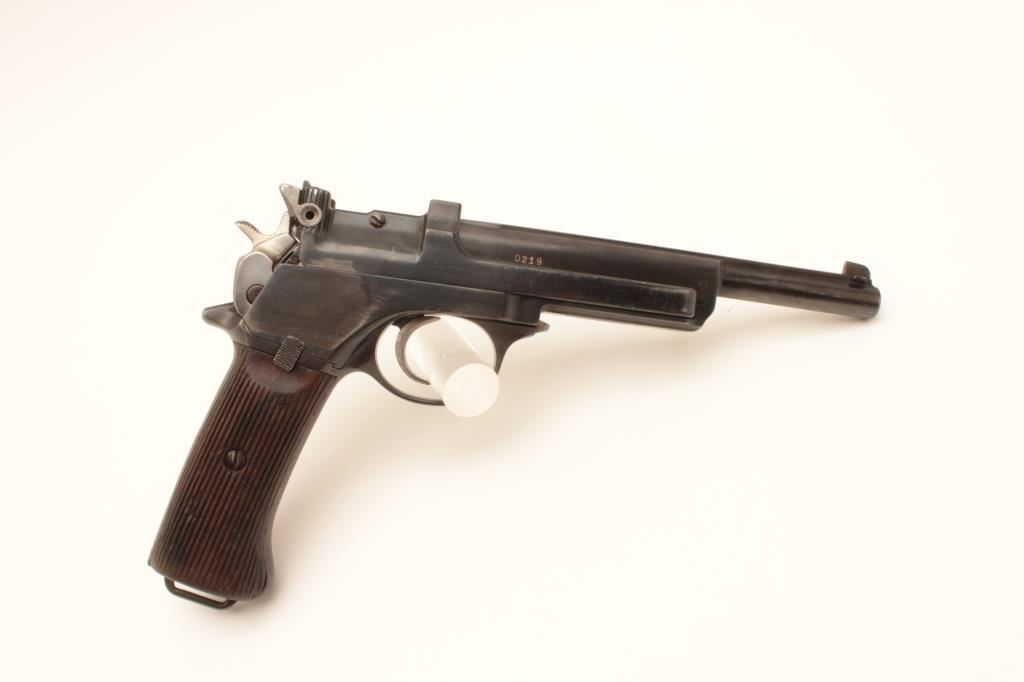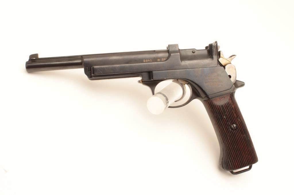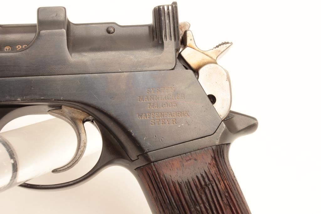 Mannlicher Model 1905 semi-automatic pistol, 7.65 mm caliber, serial #02192841. The pistol is in very good overall condition with a 6 ¼” barrel. The pistol retains the majority of an old quality re-finish with only handling marks and some thinning of finish at the rear of the frame noted. The frame is marked, “WAFFENFABRIK STEYR” at the rear of the pistol. The wood grips are in good condition with mars and compressions consistent with carry and use and a lanyard loop at the base. The bore is good, the action functions and markings are sharp. Est.: $500-$1,000. (C+R).