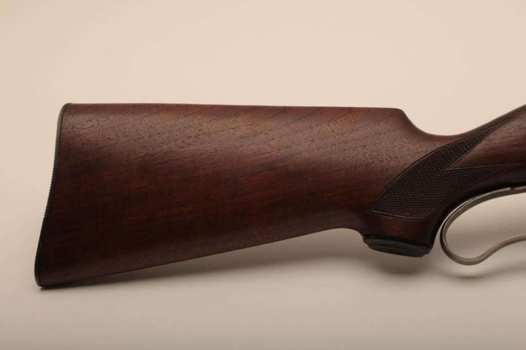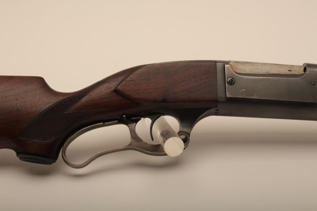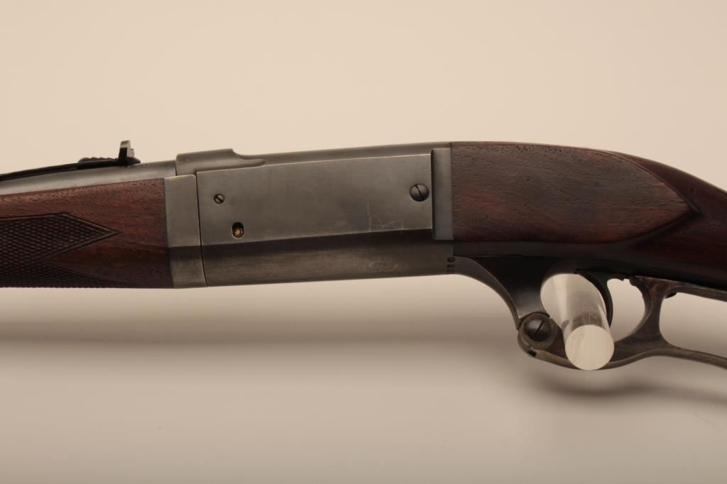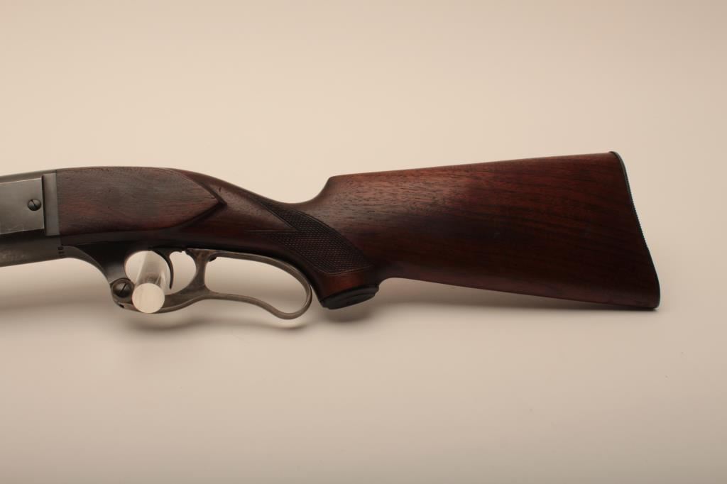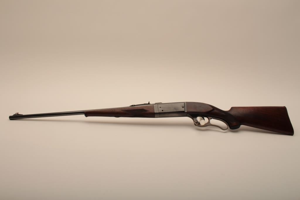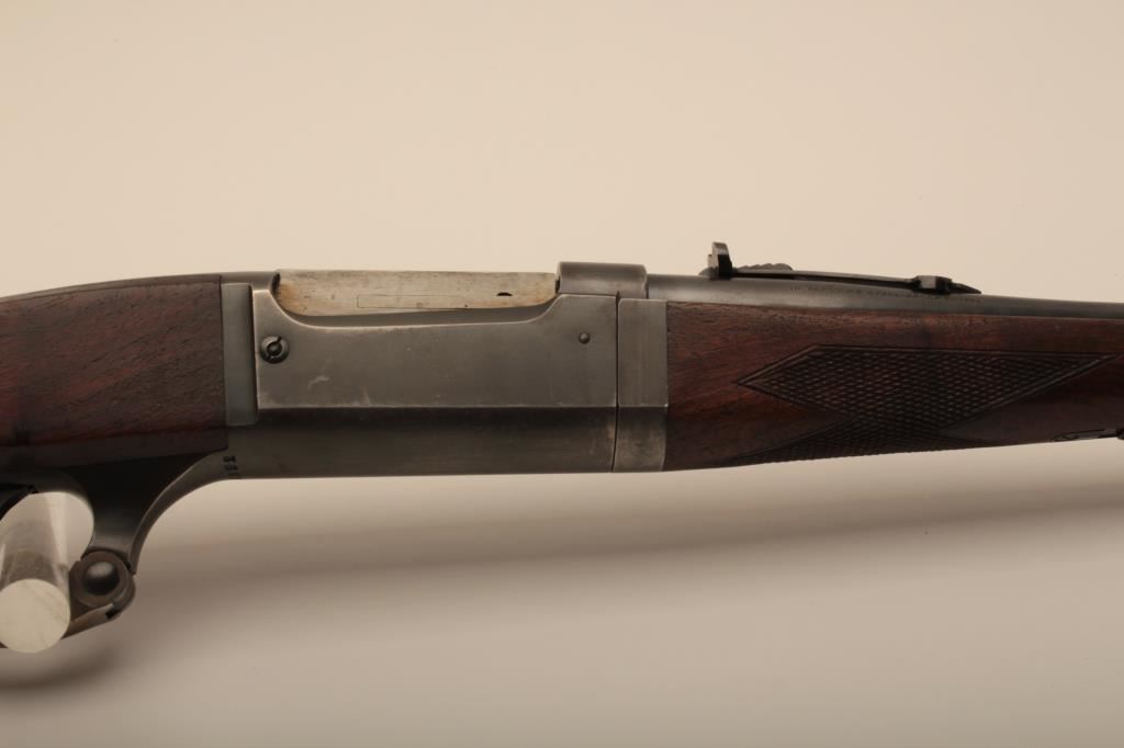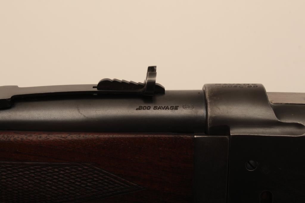 Savage Model 99 Takedown lever action rifle, .300 Savage caliber, Serial #366936. The rifle is in fine overall condition with a 24” round barrel with a ramped blade front sight and standard rear sight. The metal surfaces retain the majority of their blue finish with small mars on the barrel. The receiver shows thinning of the finish on the underside and several small scratches. The rifle features the brass shell counter and shows beautiful, vivid case hardening on the lever, particularly on the protected portion of the assembly. The checkered wood stocks are in very good condition with the fore end serialized to the rifle. The butt stock features a pistol grip and ends with a Savage marked steel butt plate. The bore is very good, the action is crisp and markings are sharp on this desirable Savage manufactured in 1938. Est.: $400-$800. (C+R).