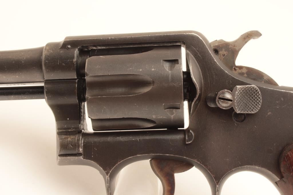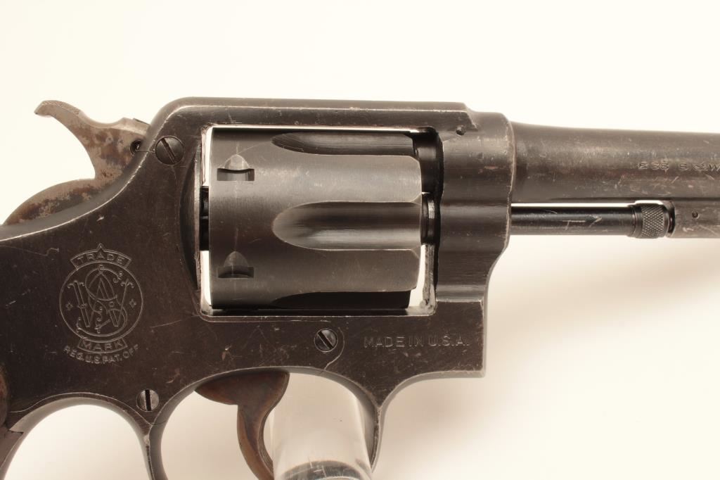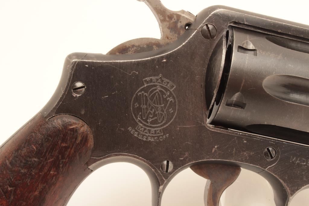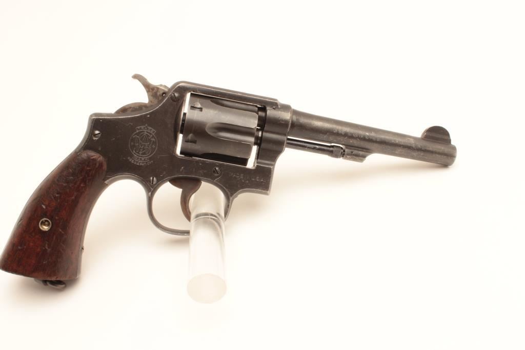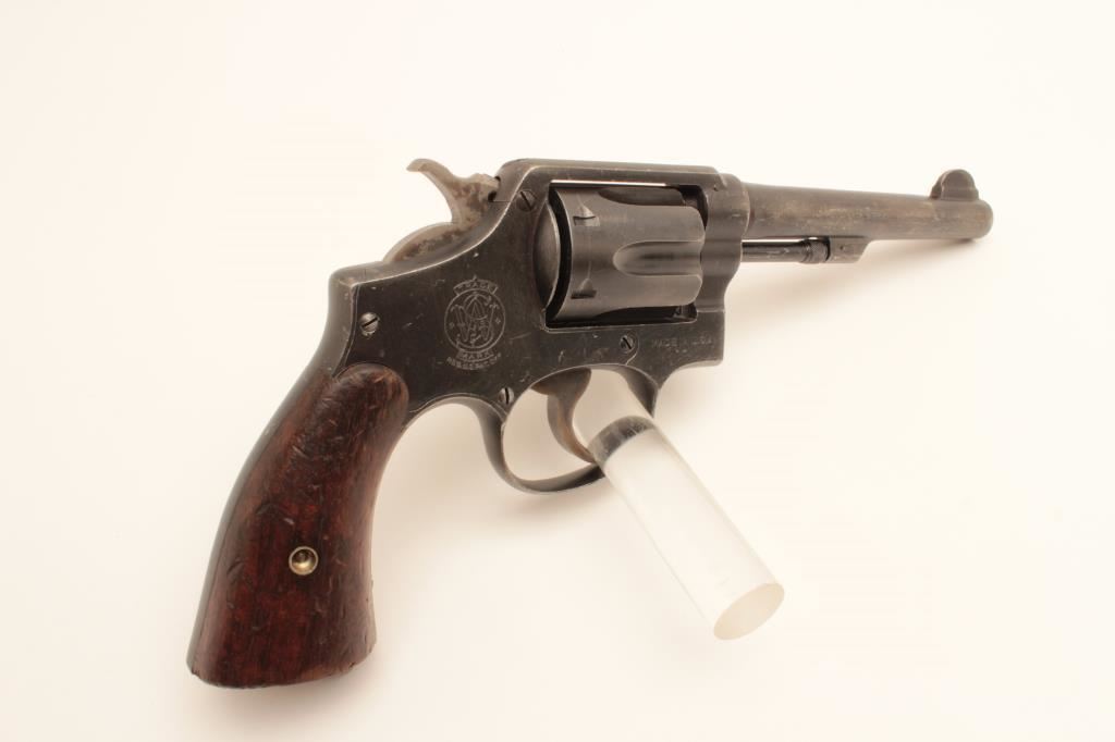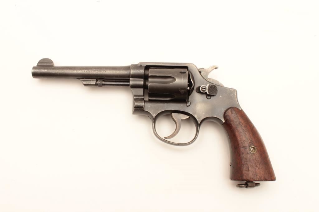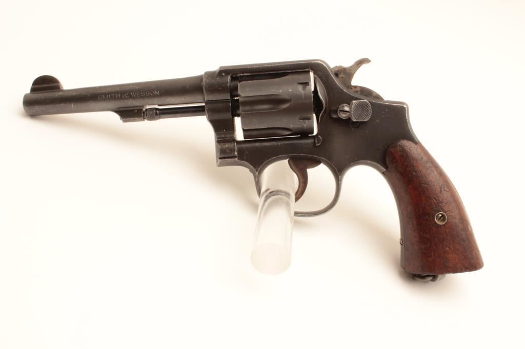 Smith and Wesson Victory Model revolver, .38 Special caliber, Serial #V443144. The pistol is in very good overall condition with a 5” barrel. The metal surfaces retain the majority of their military finish with wear at the muzzle and a drag line on the cylinder. The smooth wood grips are in good condition with small mars and a lanyard ring in the butt. The left side top strap is marked, “U.S. PROPERTY G.H.D. “. The bore is good, the action is crisp and the markings are sharp on this WWII era pistol. Est.: $250-$500. (C+R).