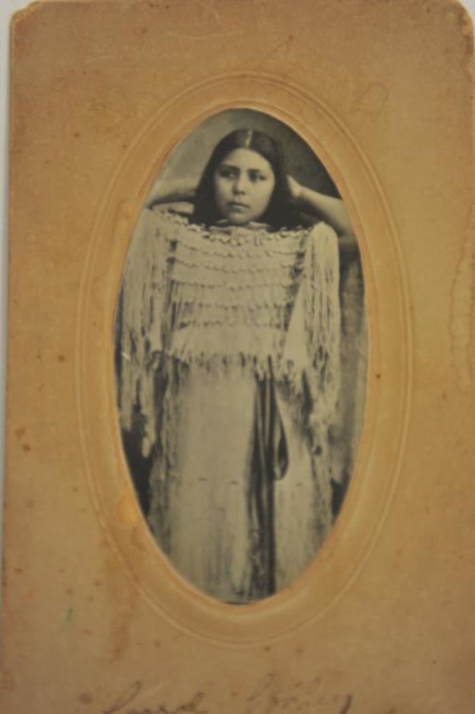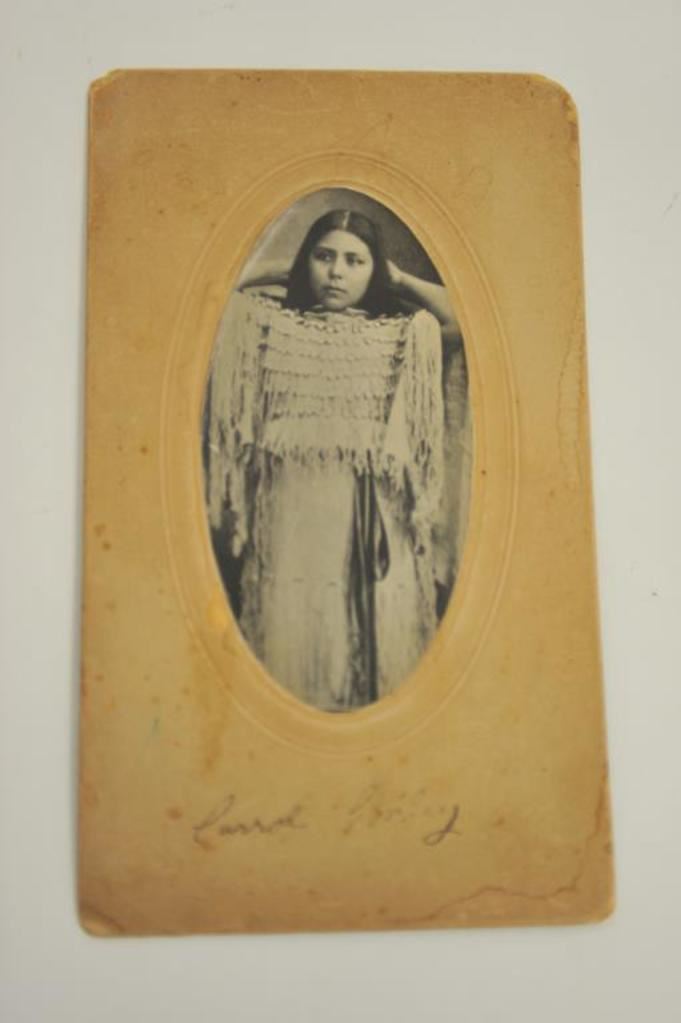 Original photo on cabinet card inscribed in pen, “Carrol Conley”; Ex-Sterling Fenn collection; young Indian Princess wearing shell decorated dress; back of card is inscribed in pencil “Bill Cody Squaw/Carroll Conley/1890”. Est.: $150-$300.