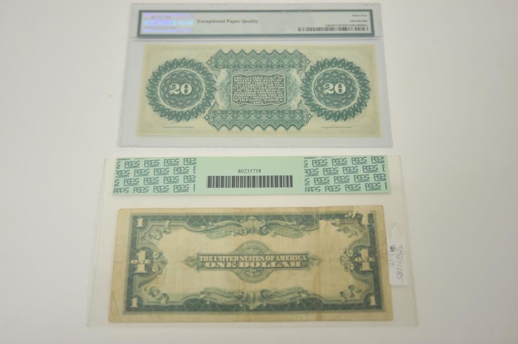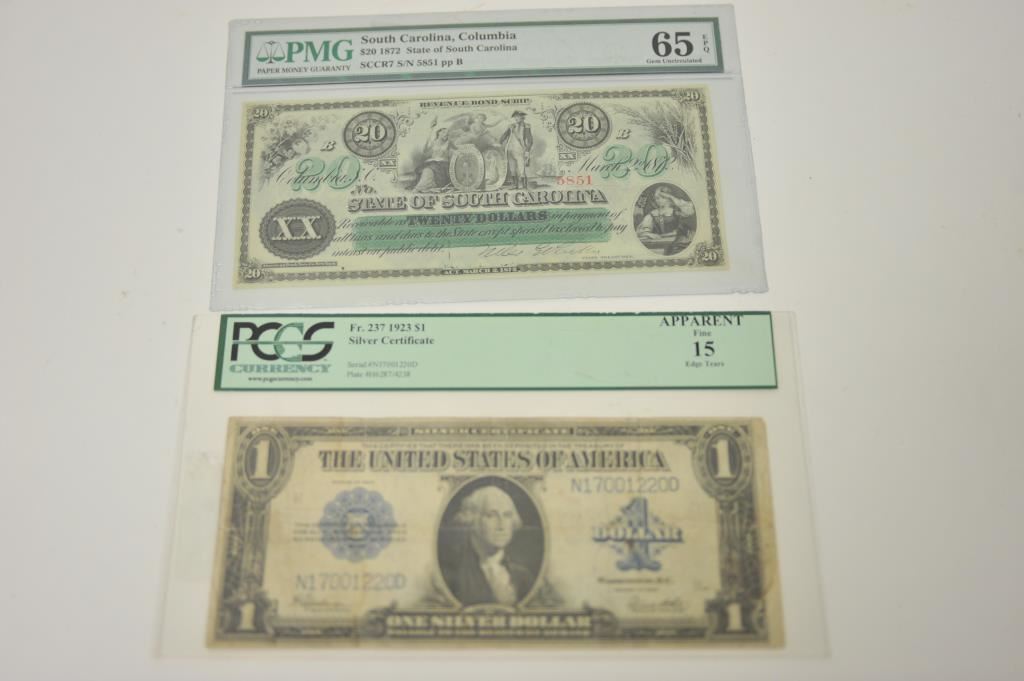 Lot of 2 collectible U.S. currencies including a State of South Carolina $20 Revenue Bond Script dated 1872 and PMG graded “Gem Uncirculated”; the other a large U.S. $1 Silver Certificated dated 1923 and PCGS currency graded Fine with edge tears; both in protective sleeves. Est.: $75-$150.