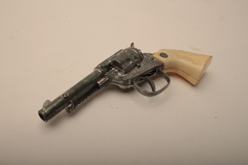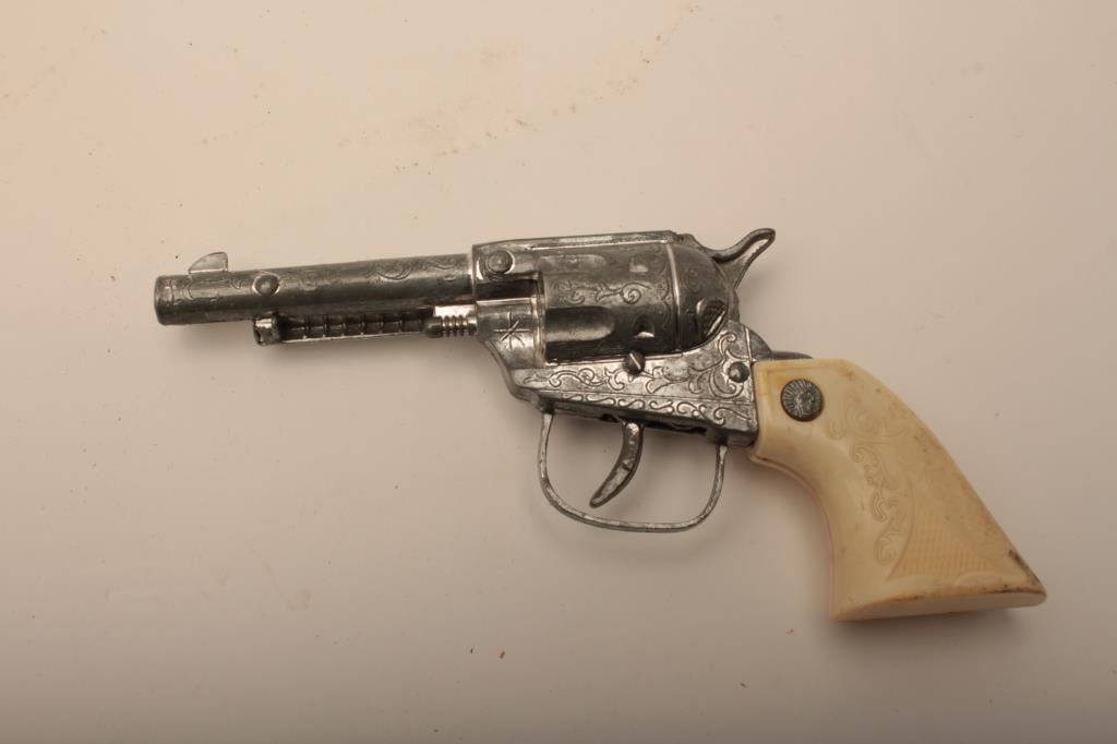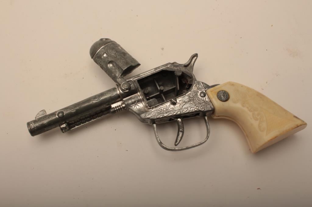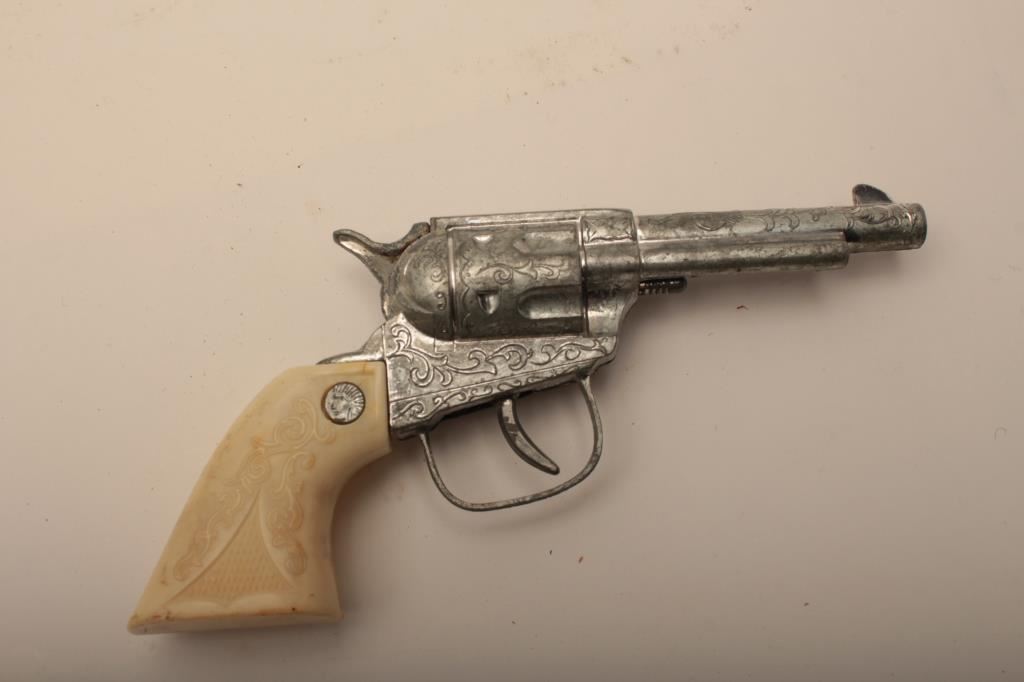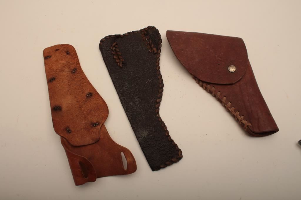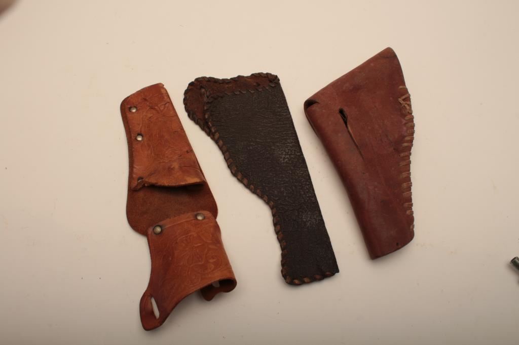 Lot of 3 vintage holsters, one flap holster for smaller revolver, one vintage slim jim holster made on the range, and one vintage cap gun and holster left hand rig. Est. $25-50