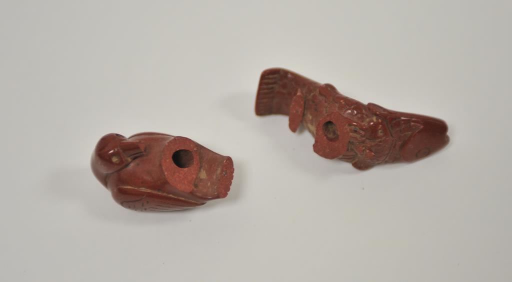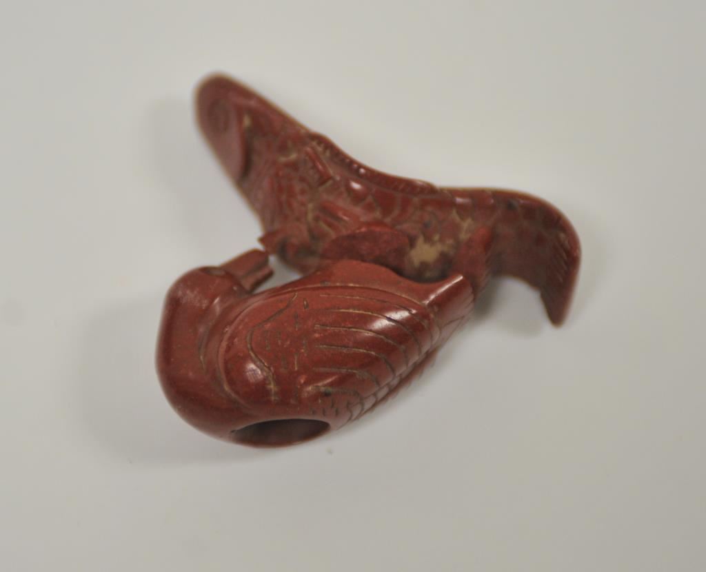 Riker case containing old carved red stone hand smoking pipe of bird eating fish, with bird and fish separated by break (appears repairable) and a black stone with penciled “2887/____ Co. Tenn.” marking (possibly an inventory code). Est.: $50-$100.