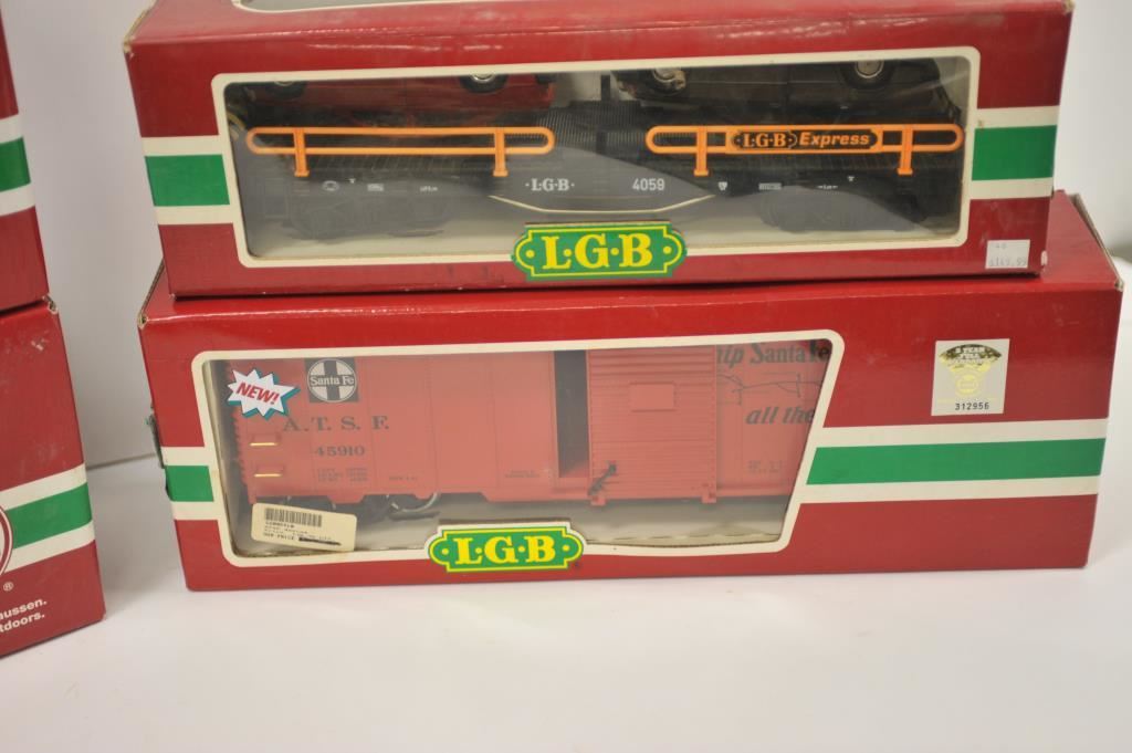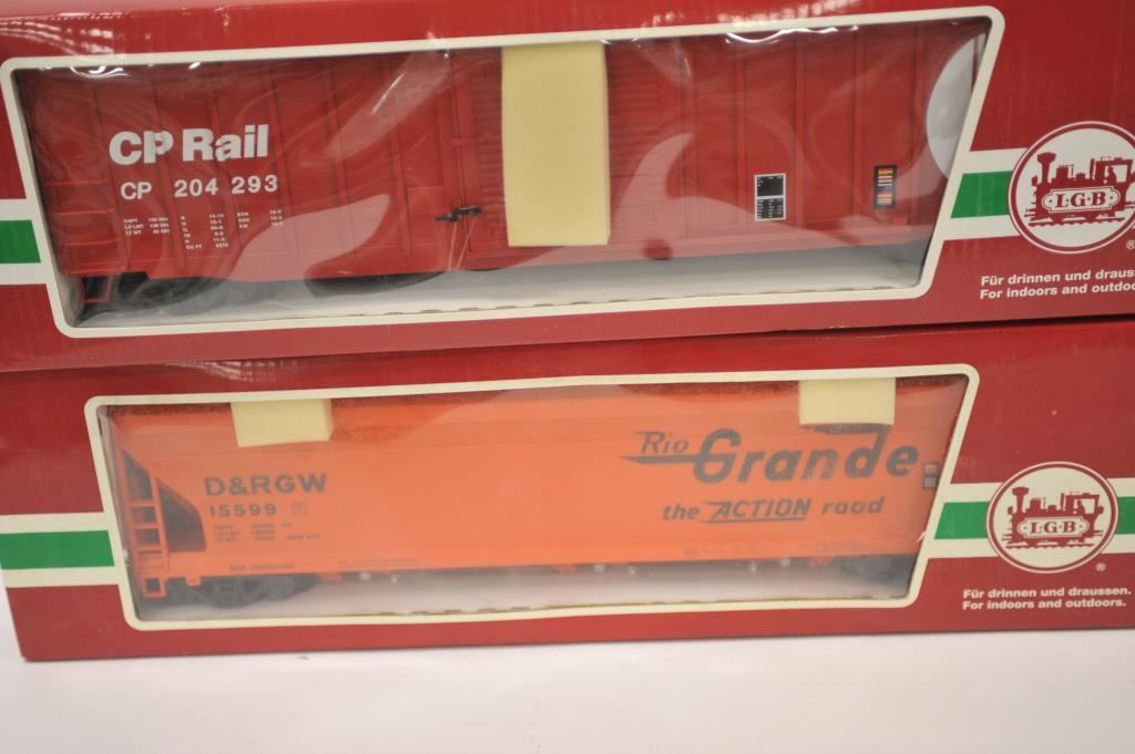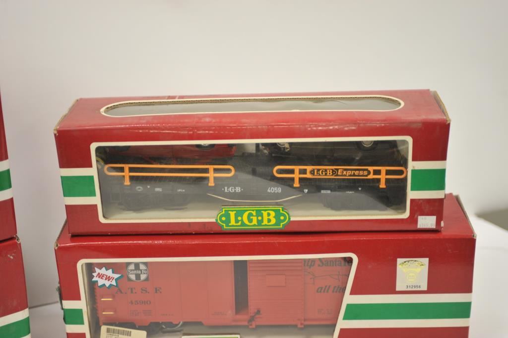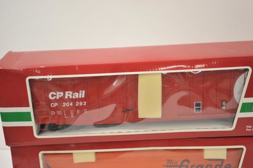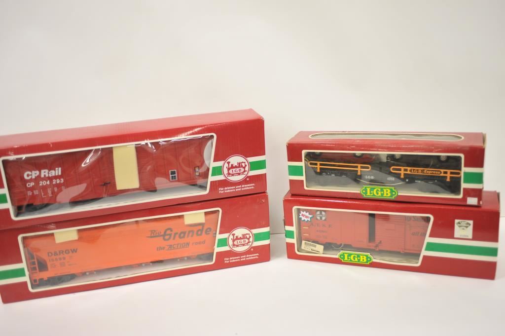 Lot of 4 like new in factory boxes LGB toy railroad cars including a CP Rail car, a Rio Grande car, an A.T.S.F. car and an auto carrier flat car with two automobiles. Est.: $200-$400.