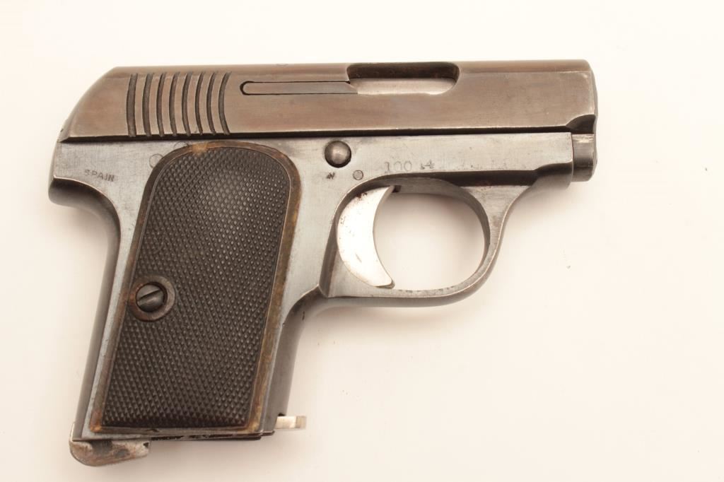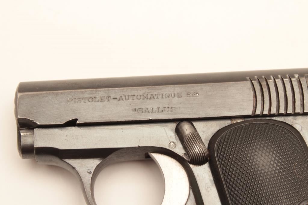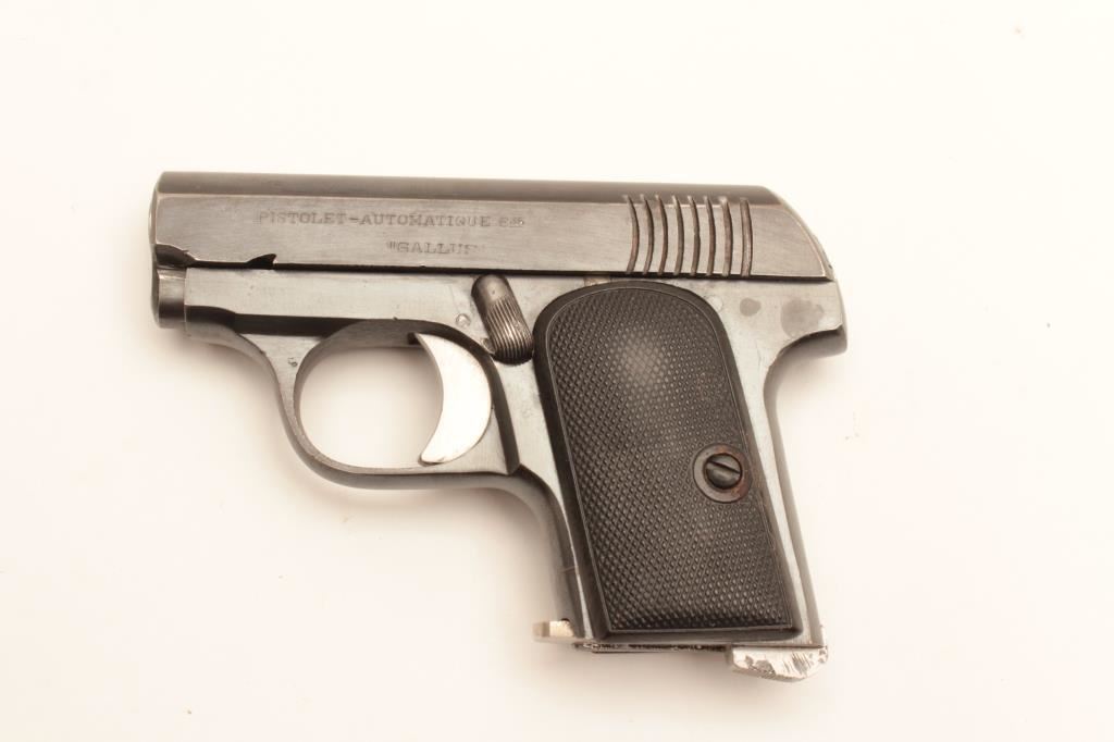 Spanish pocket semi-automatic pistol marked “Gallus”, .25 caliber, 2” barrel, blued finish, checkered hard rubber grips, S/N 10014; overall good condition with muted blued finish, good bore, crisp action, good grips. (C&R/PPT). Est.: $75-$150.
