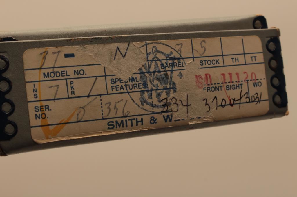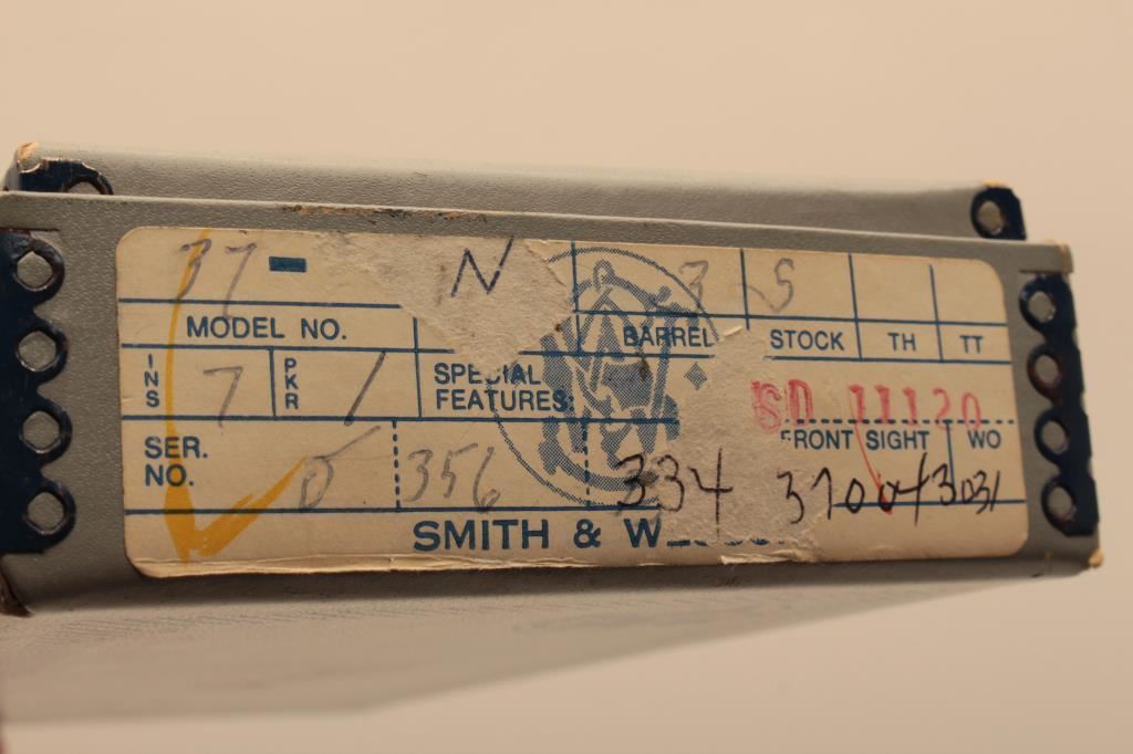 Smith & Wesson Model 37 (no dash) Airweight DA revolver, .38 Special caliber, 3” barrel, nickel finish, checkered wood medallion grips, S/N J356334; like new condition with factory two piece silver and blue cardboard box displaying end label numbered to this gun; instructions and cleaning tool included. (Modern/NO CAL. SALE). Est.: $400-$800.