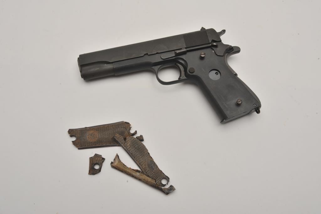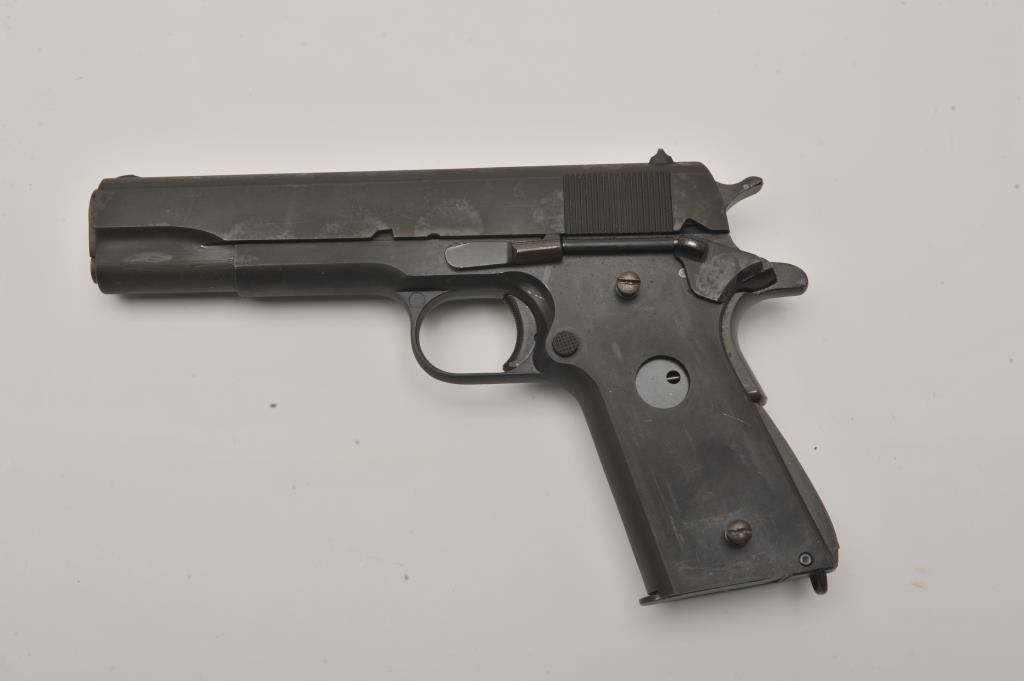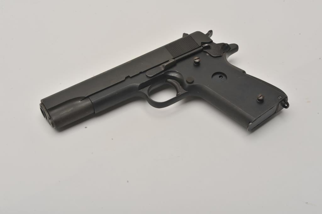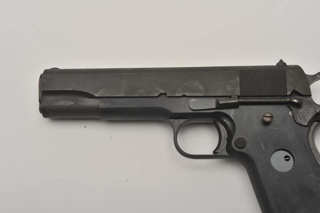 Custom 1911 semi-automatic pistol, .45 caliber, Serial #0738. The pistol is in good overall condition with a 5” barrel. The slide is a Colt 1911A1 in good condition with the majority of its blue finish showing high point edge wear. The frame is marked, “AR SALES” and is also in good condition. The grips are missing and the lot includes the remnants of an old set of grips. The bore is good, the action functions and the markings are legible. The lot includes one correct magazine. Est.: $400-$800. (Modern/PPT).