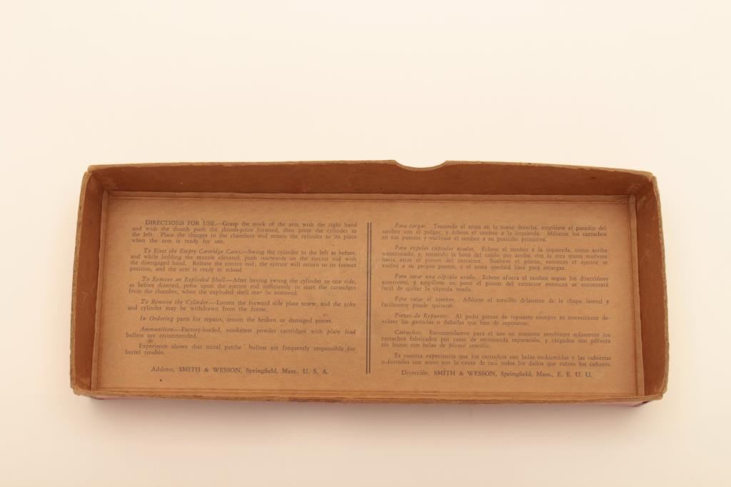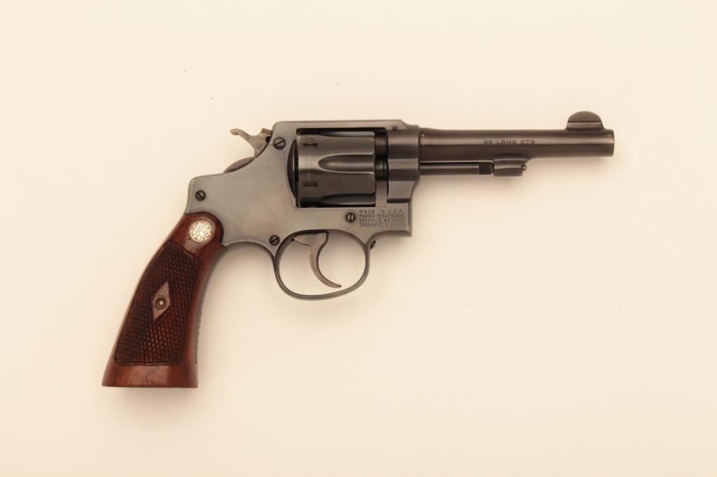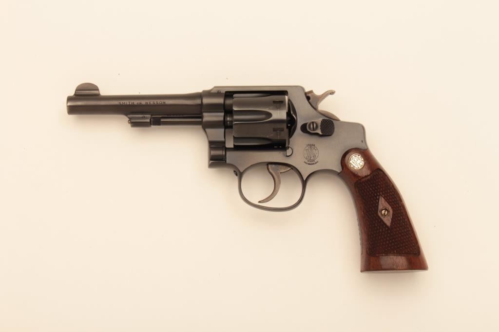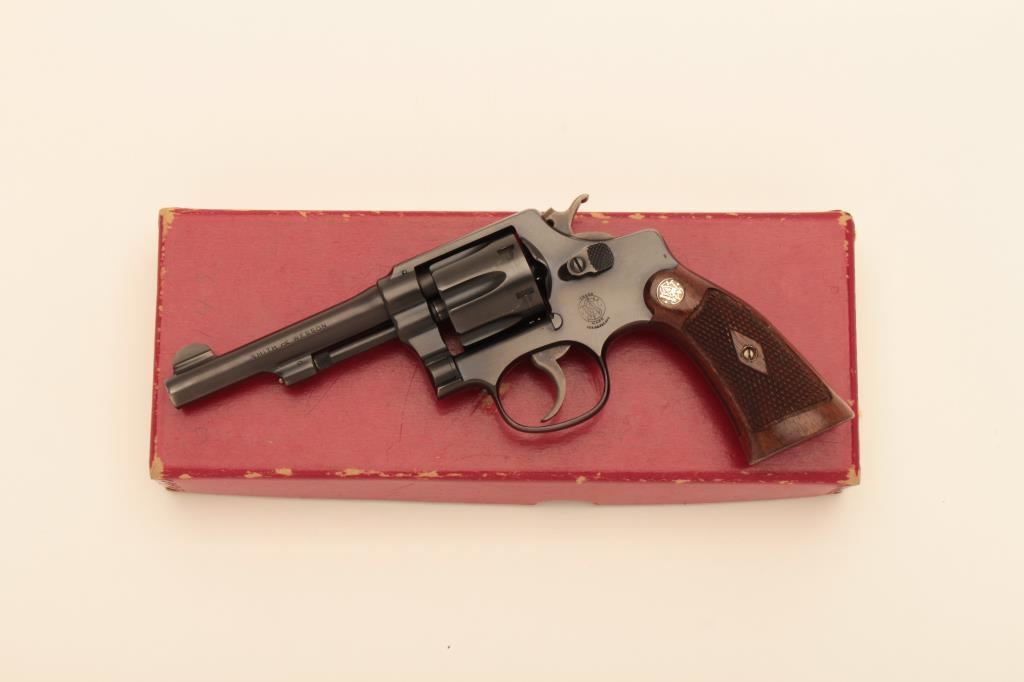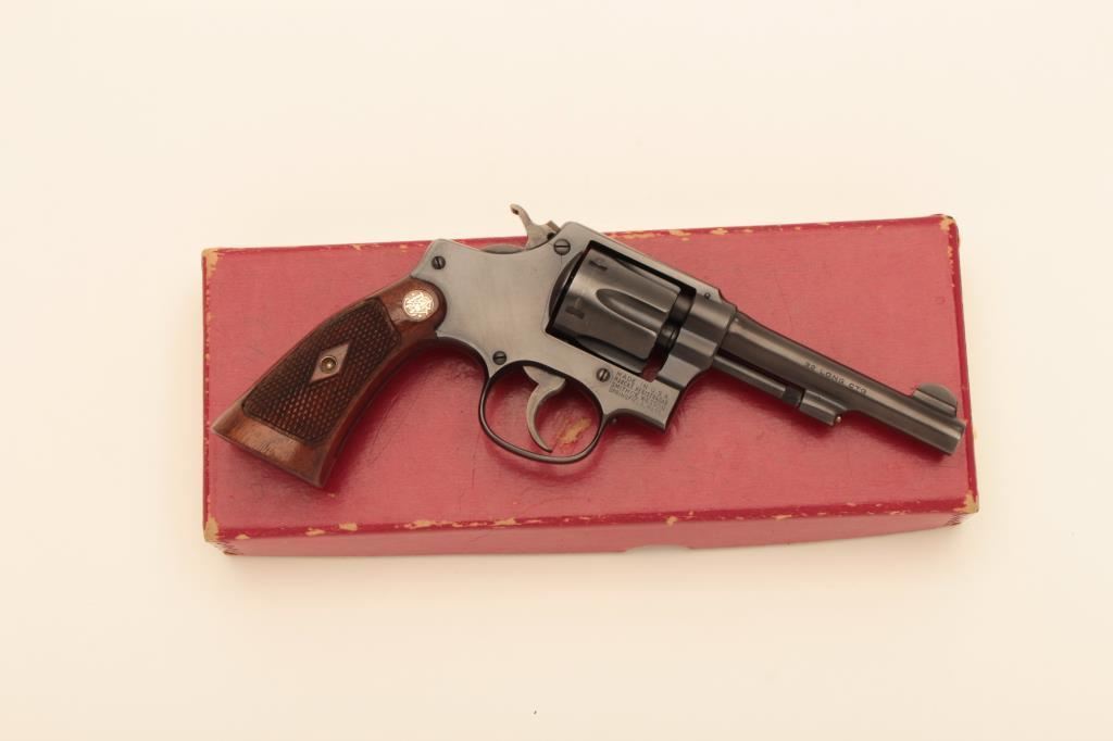 Smith & Wesson 5 screw Regulation Police DA revolver, .32 Long caliber, 4” barrel, blued finish, checkered wood medallion grips, S/N 586483; near new condition with factory two piece red cardboard box and full end label. (C&R/NO PPT). Est.: $600-$1,200.
