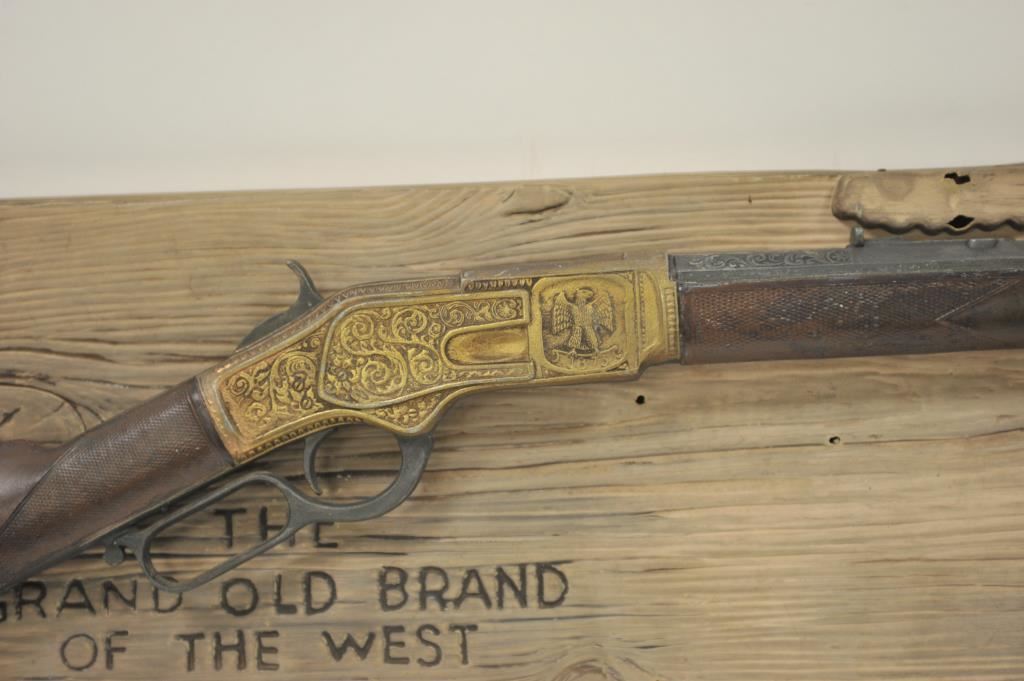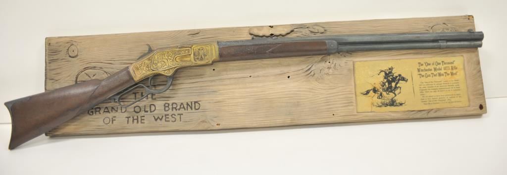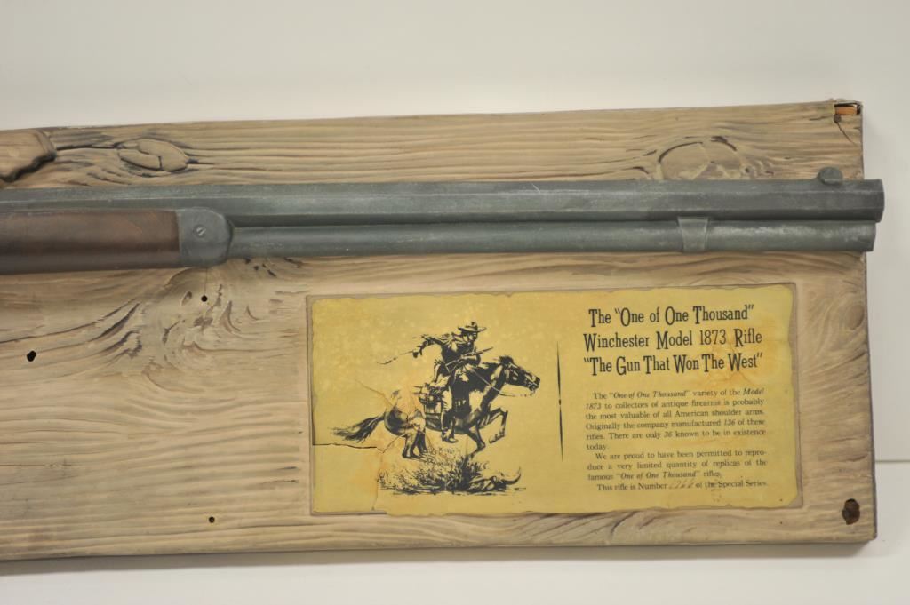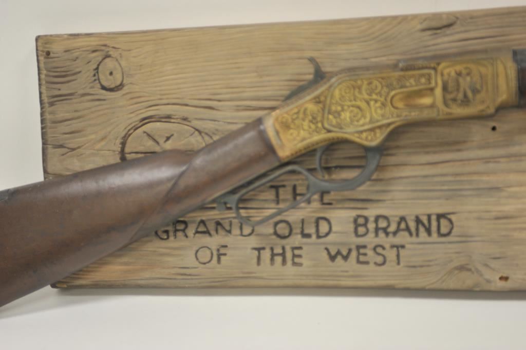 Wincheser One of One Thousand cast metal display model mounted to a plastic display sign, "The Grand Old Brand of the West". Rifle has been touched up with paint in several places. Plastic mount shows several cracks. Good overall. An old Eastside Old Tap beer advertiser which is missing the beer logo. Est. $200-400