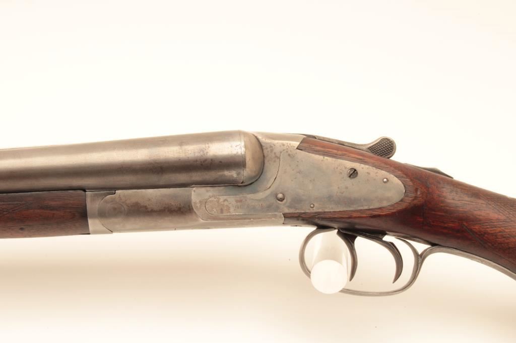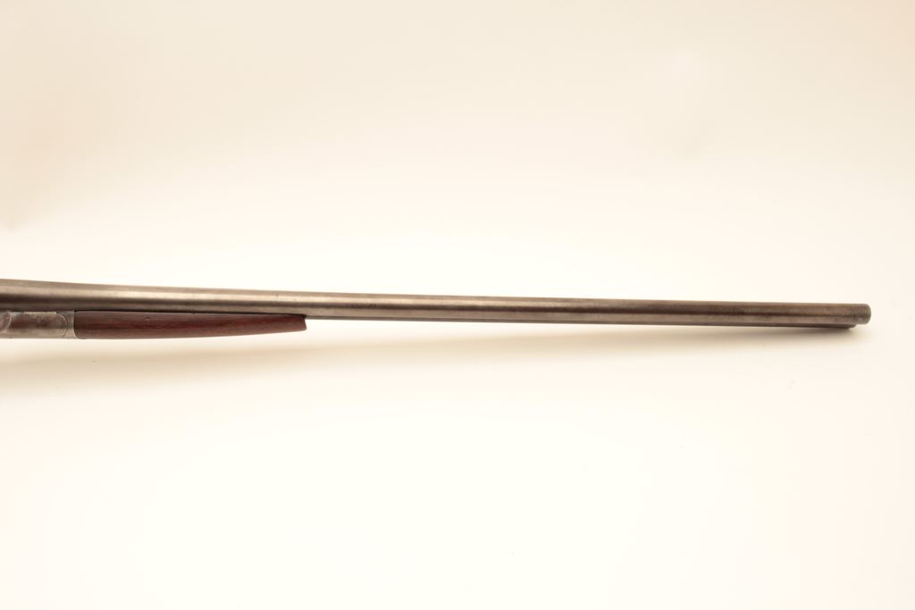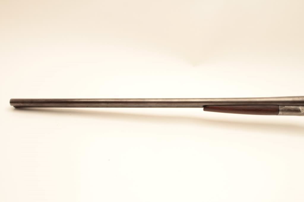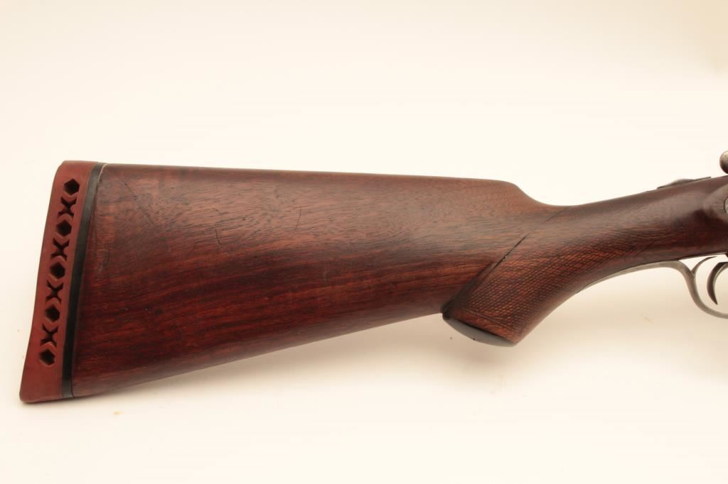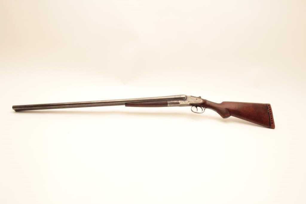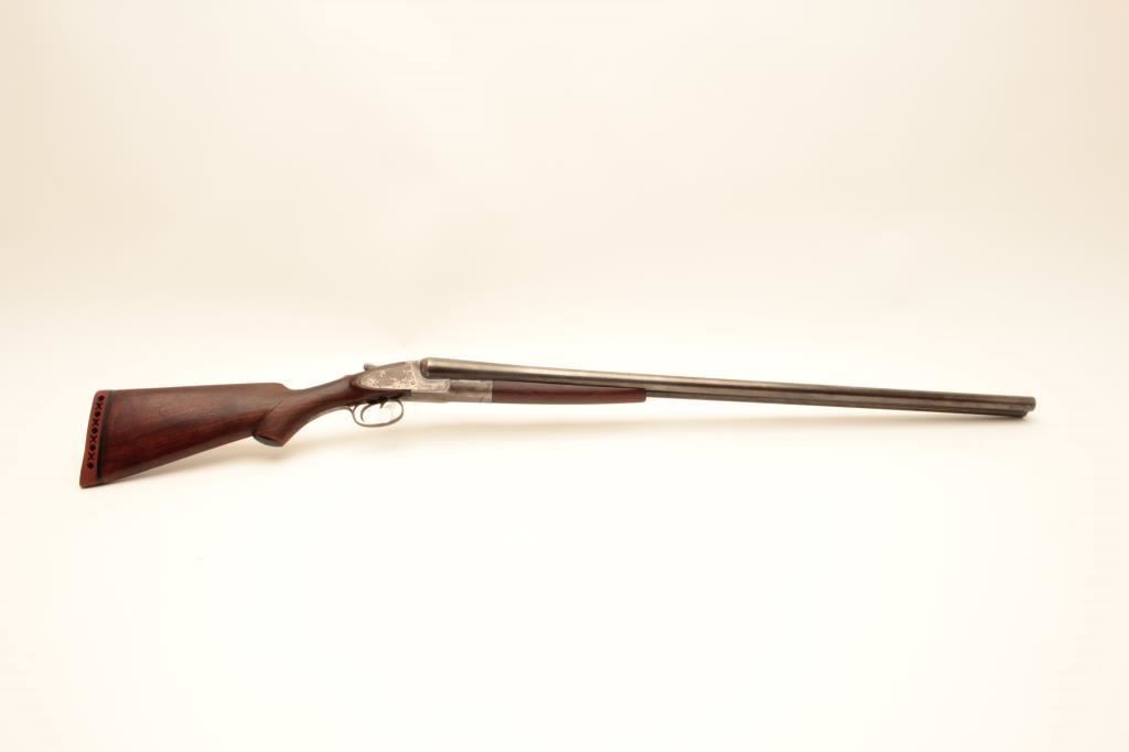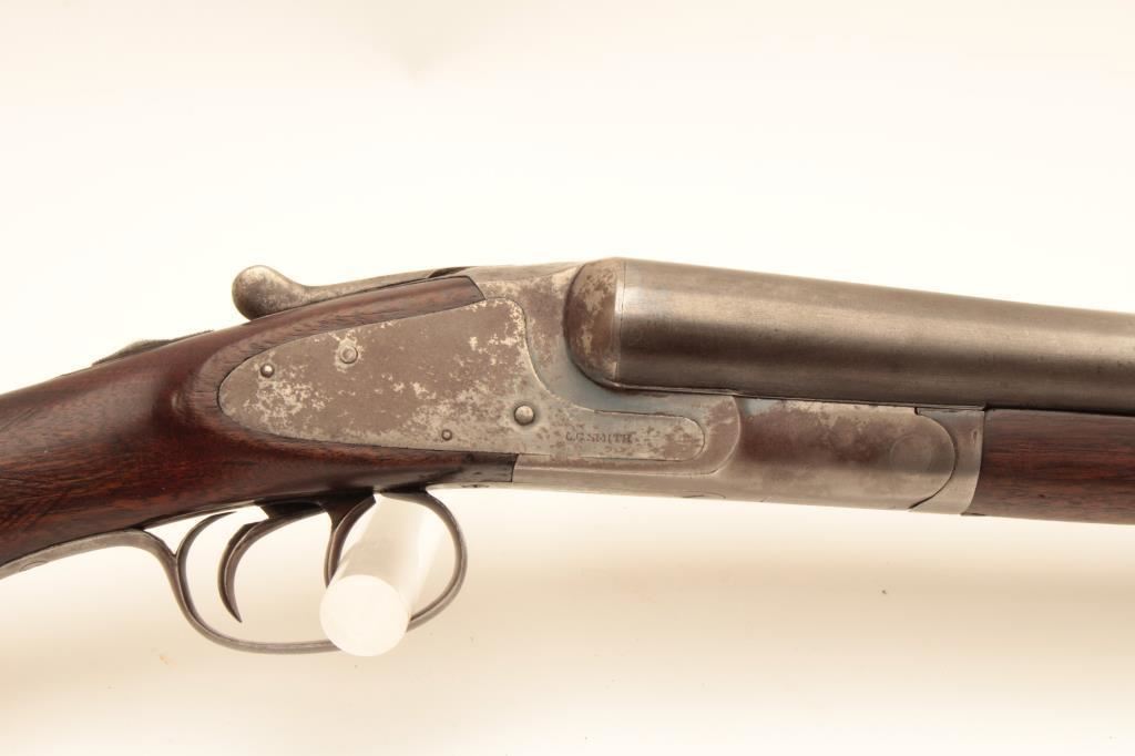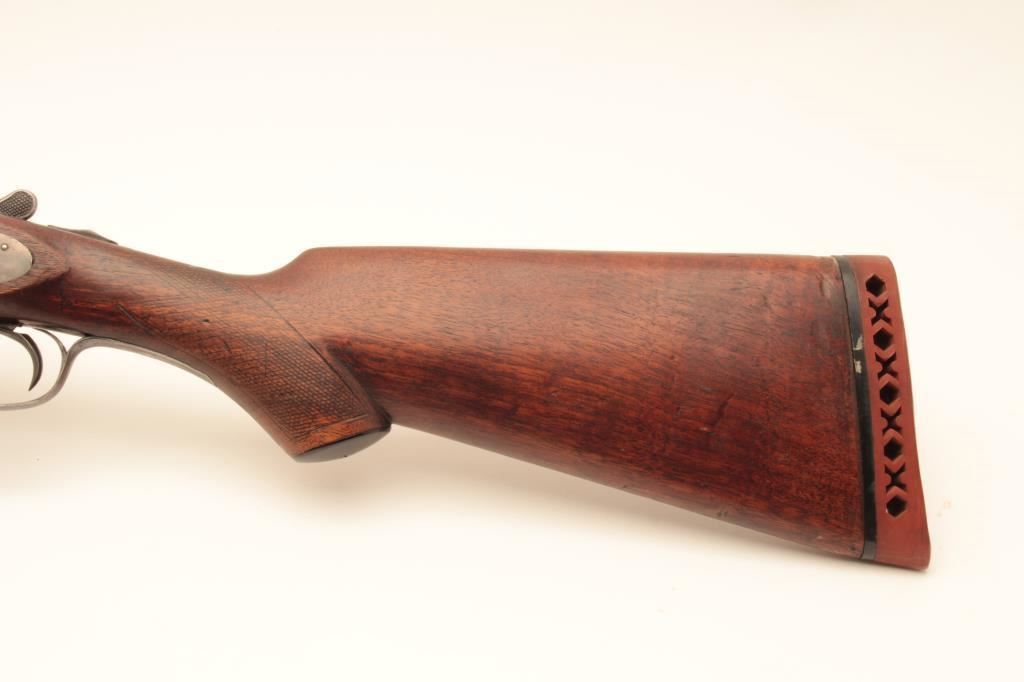 L.C. Smith 12GA Field Grade SxS shotgun with 32” barrels choked improved modified in both barrels. Good to very good original condition with 50%-60% thinning and toning finishes. The stocks are fair to good with typical hair line crack at the rear of side lates (Very Small). The bores are a little worn and locks tight. Poorly replaced pad with 15” pull. Would improve with T.L.C. and checkering is light. (C&R) Est.: $250-$500