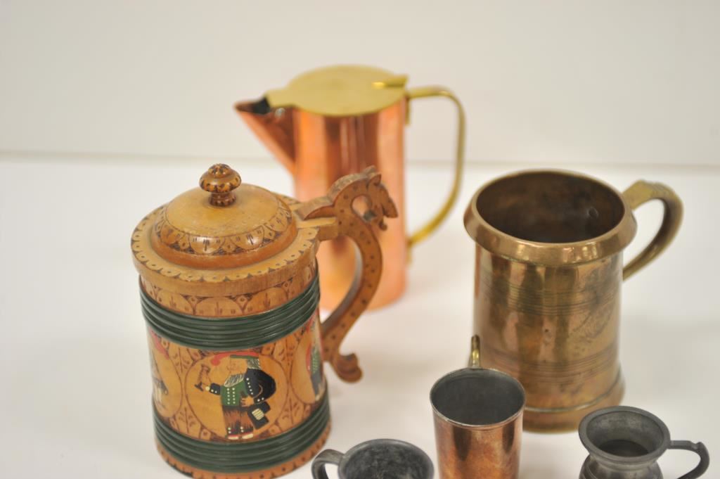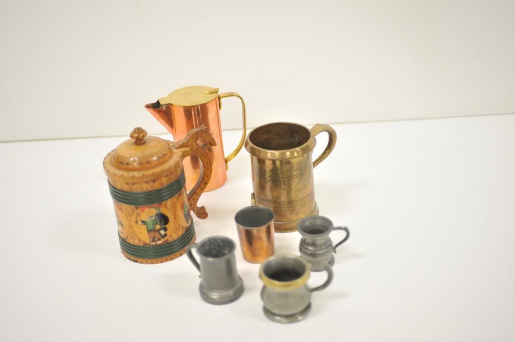 4 small metal bar pitchers (2 1/2 Gill marked), Pabst marked, copper pitcher, VR marked brass "pint" mug for beer. Hand painted on wood German folk art stein as souvenier from Skudenesharn, probably pre WWII. Est. $100-300