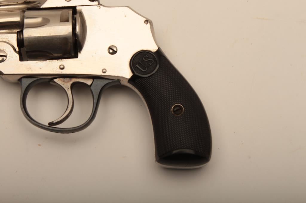 U.S. Revolver Co. .38 S&W caliber double action hammerless revolver, S/N 85245. 90%-95% original nickel with some peeling and erosion where nickel is missing. The grips are near excellent. Works well and bright bore. Circa 1910-1930. (C&R/PPT) Est.: $60-$120