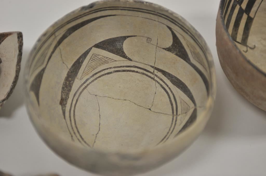Lot of old Indian pottery including a bowl with black painted design; approximately 7” in diameter and 3.5” in height, good condition; another bowl with painted design, also approximately 7” in diameter and 3.5” in height; should several repairs; a mug with “keyhole” in handle, approximately 4” in height and several old chips to rim; also broken parts to another brown and black design painted bowl. Consignor notes Mogollon/Mimbres Indians for bowls and Mesa Verde Indians for mug. Est.: $200-$300.