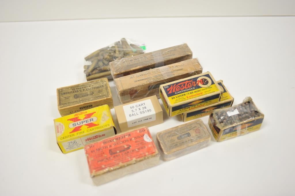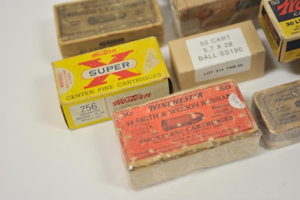 Lot of collector ammunition including a box of Winchester .44 S&W Russian cartridges; 2 boxes of Remington Arms-UMC .41 Swiss cartridges (for Vetterli Rifle); a box of Western .256 Winchester Magnum cartridges; 2 boxes of Western .30 Luger (7.65mm) caliber cartridges; a box of scarce .35 S&W cartridges by Remington-UMC; a partial box of Peters .41 Long Colt DA cartridges and more! Est.: $200-$300.