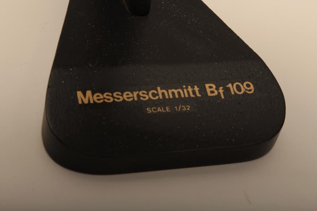 Professional display model of a Messerschmitt Bf 109, 1/32 scale, with wooden display stand. 12 3/8" wingspan. Model is in fine condition overall, having been displayed, and could use a light cleaning. Est. $150-300