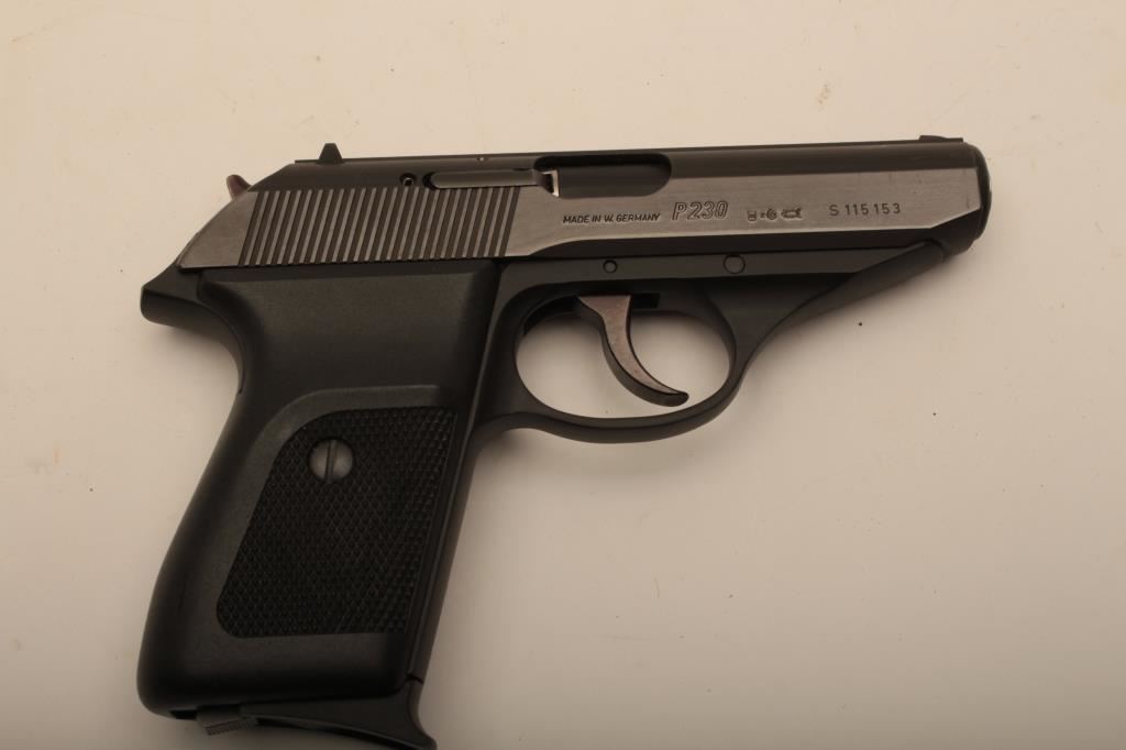 Sig Sauer P230, #S115153, .380 cal., 3 5/8" barrel, blued finish with plastic checkered grips. Pistol is in fine condition overall, original finish is just starting to thin at the edges, with minor handling marks, bore is very good, action is excellent. Includes one correct mag. (Modern / PPT) Est. $350-700