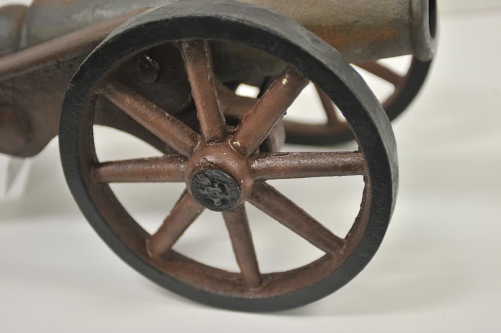 19th-20th century all cast metal signal cannon with 12” tube and metal wheels. 1 ¾” bore. Measures approximately 20” from muzzle to end. Very heavy. Est.: $500-$1000