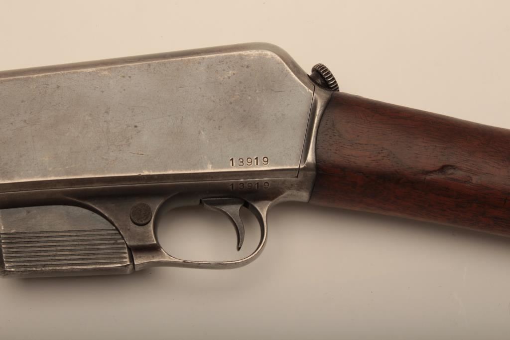 Winchester Model 1905 .351 caliber Semi-Auto rifle with straight stock, S/N 13919. Also no markings on factory mag which is an early feature. Good overall condition with 60%-80% original thinning and toning blue finish drifting on sides and edges of action. The stocks are good with minor imperfections and original butt plate retained. Shows an early bracket mounted on fore end cap to stock which may have been to lock in Police type storage or prison use. The action is tight and the bore is bright. (C&R) Est.; $300-$600