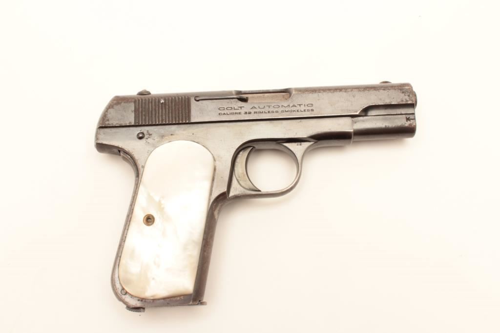 Colt Model 1903 Pocket Hammerless semi-automatic pistol, .32 ACP caliber, Serial #436478. The pistol is in good overall condition with a 3 ¾” barrel. The metal surfaces retain the majority of their blue finish with wear at the muzzle and areas of light surface rust on the slide and frame. The smooth pearl grips are in good condition with good fit and finish. The bore is good, the action is crisp and markings are sharp. The lot includes one correct Colt marked two-tone magazine. Est.: $300-$600. (C+R/PPT).