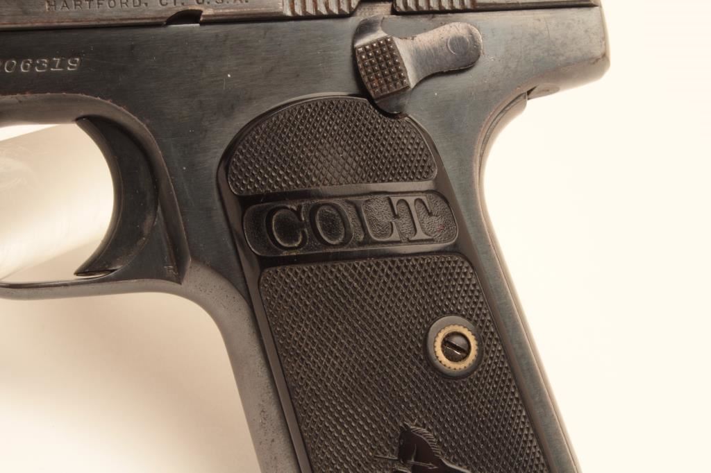 Colt Model 1903 pocket semi-automatic pistol, .32 caliber, 3.75” barrel, blued finish, checkered hard rubber grips, two tone magazine, S/N 206319; overall very good + condition with majority of original blued finish remaining, very good bore, crisp action, very good markings and grips; accompanied by a woven fabric safe boot. (C&R/PPT). Est.: $350-$700.