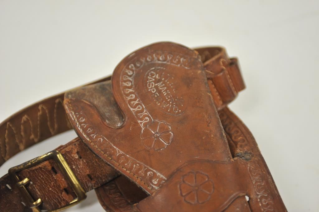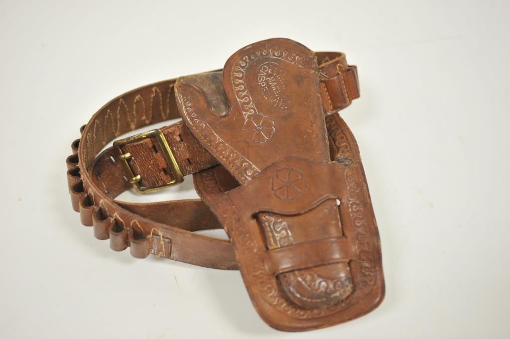 Tooled leather double loop holster marked “J. T. Irick/Maker/Casper, Wyo.”; overall good condition with unmarked leather cartridge belt. Est.: $350-$700.