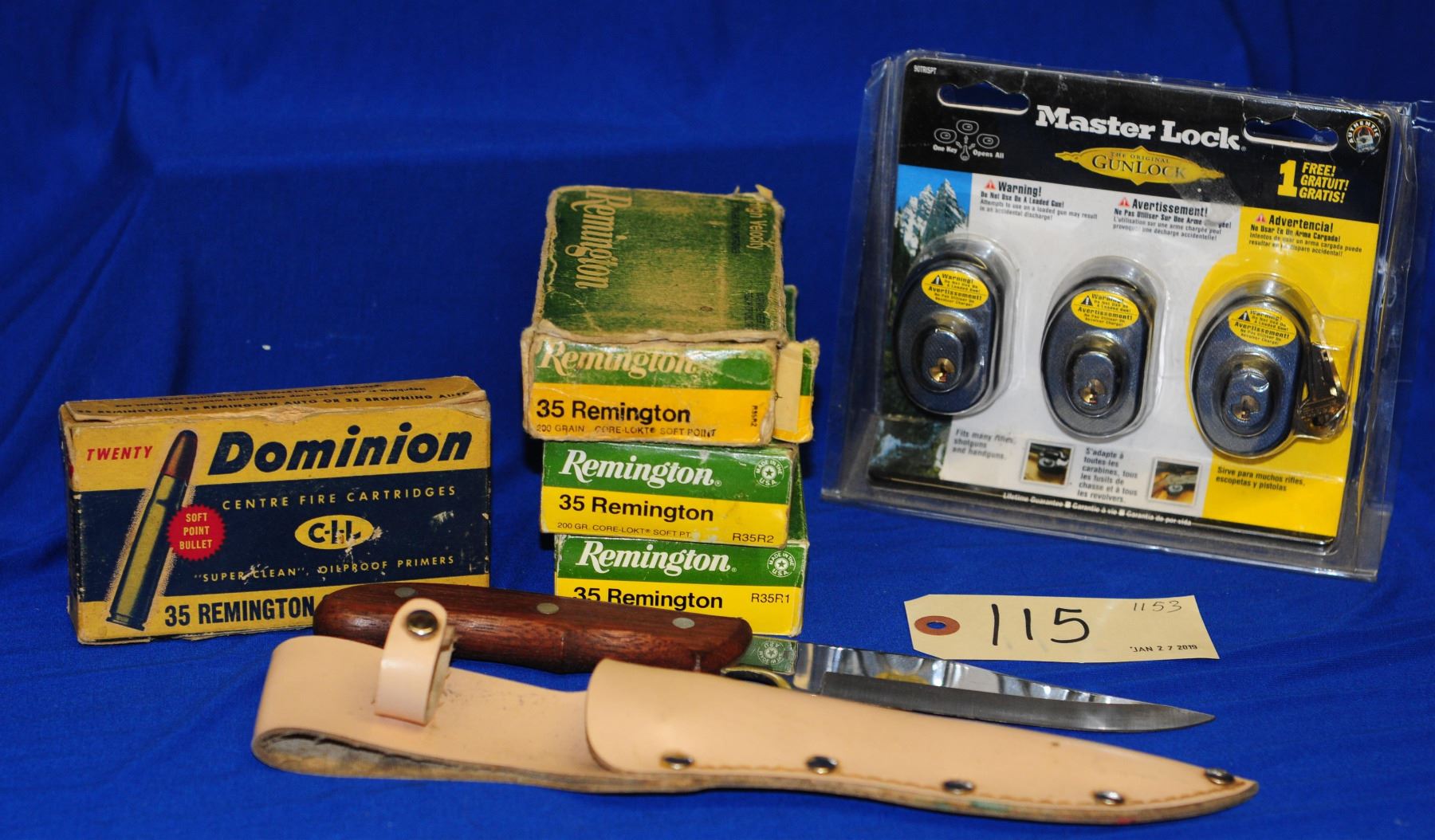 58 rnds of remington 35 Remington, 20 rnds of Dominion 35 Remington, package of three Master Lock trigger locks, Huntman 420 stainless Knife with a 5 1/2" blade
