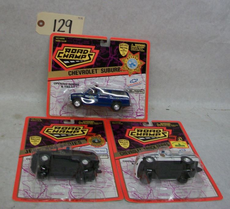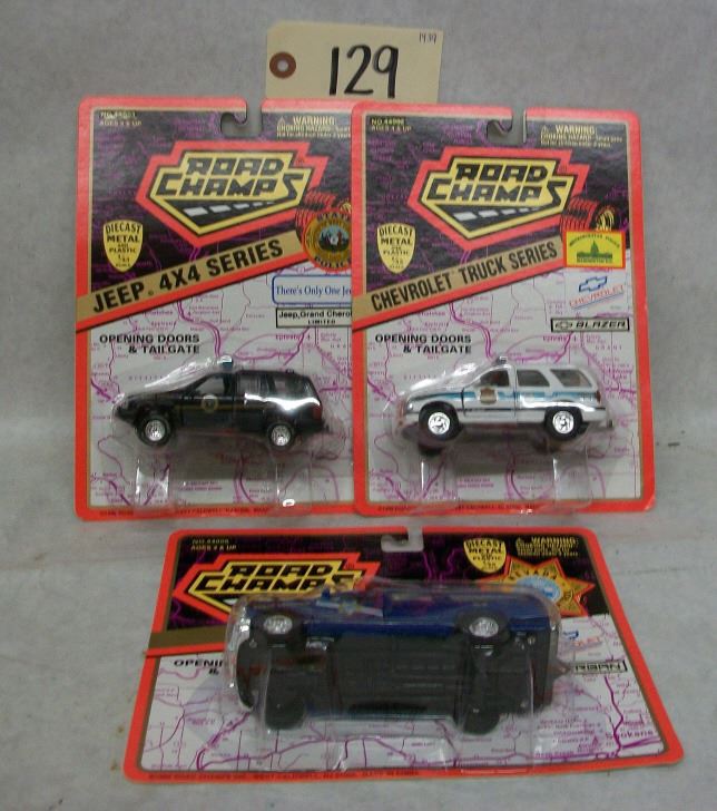 Road Champs DIe Cast Cars - Special Vehicle Series (1996) 1:43 Scale With opening doors and trunk Chevrolet Truck Series: Chevrolet Blazer Metropolitan Police (44002) Jeep 4x4 Series: Jeep Grand Cherokee State of West Virginia Police (44003) Chevrolet Suburban: Nevada Highway Patrol (44006)