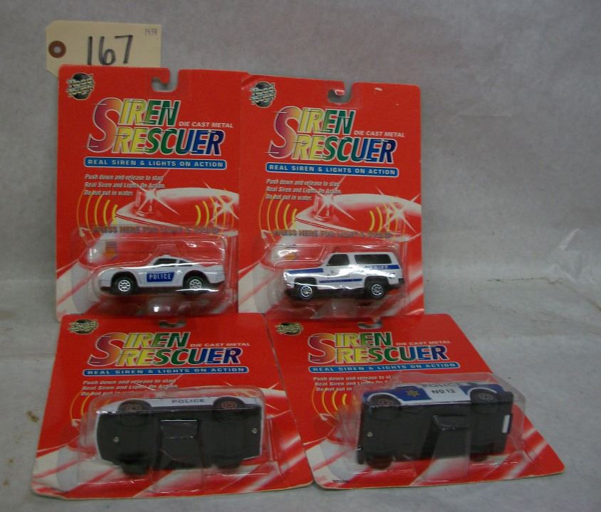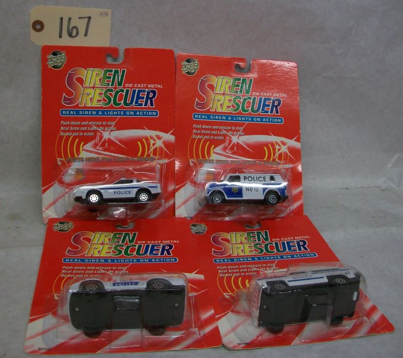 Road Tough Siren Rescuer Die Cast vehicles (set of 4) - 9030B Porche (Police Patrol), Corvette (Police Highway Chase), Van (Police No 12) Chevrolet Blazer (Sheriff 47) In original packages 1:50 scale With siren and lights on action- batteries appear to be dead