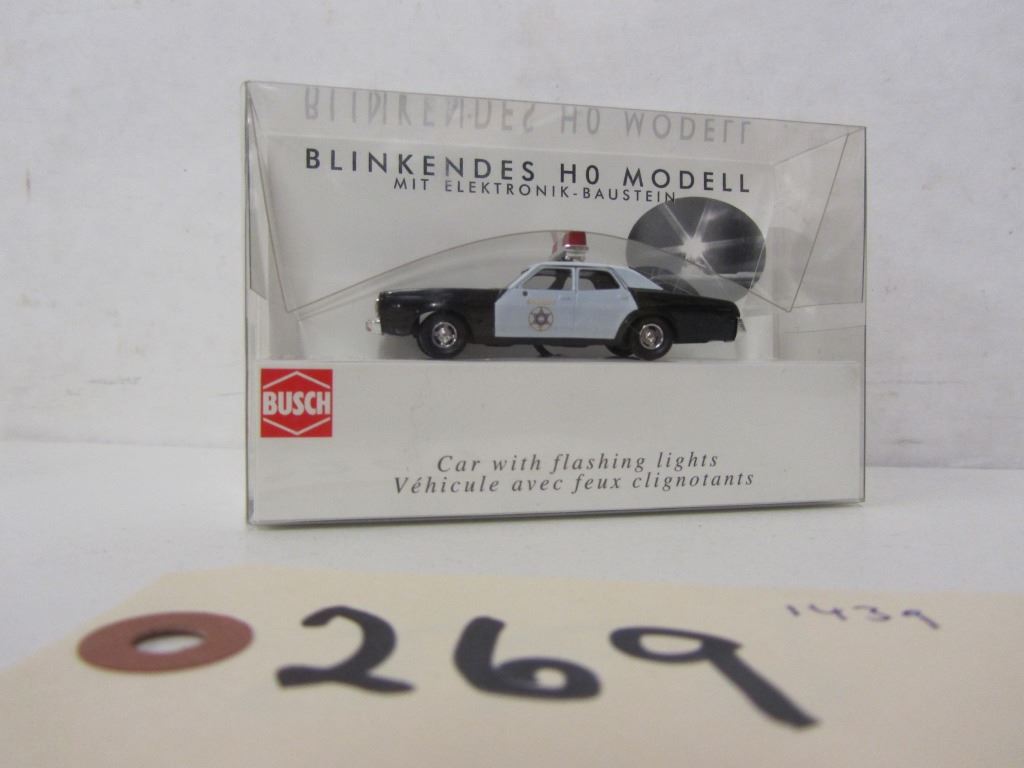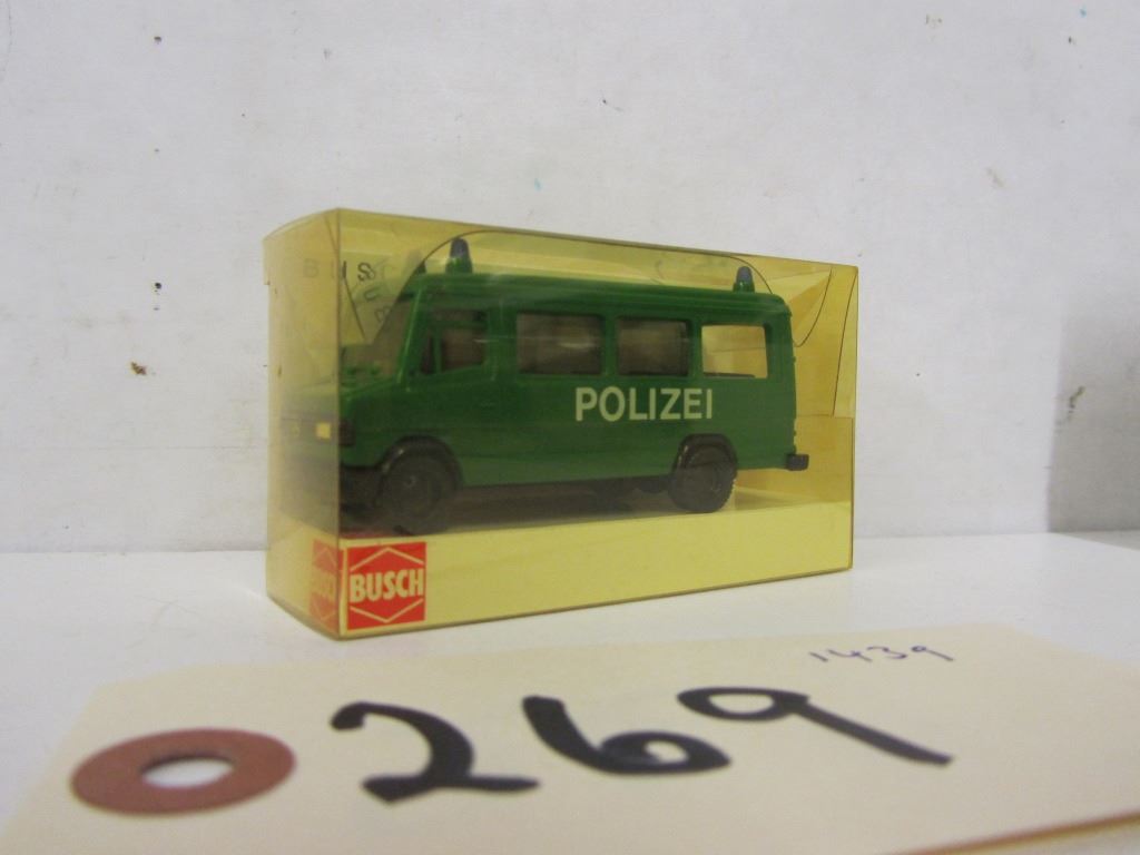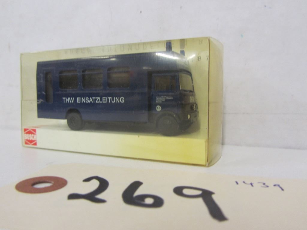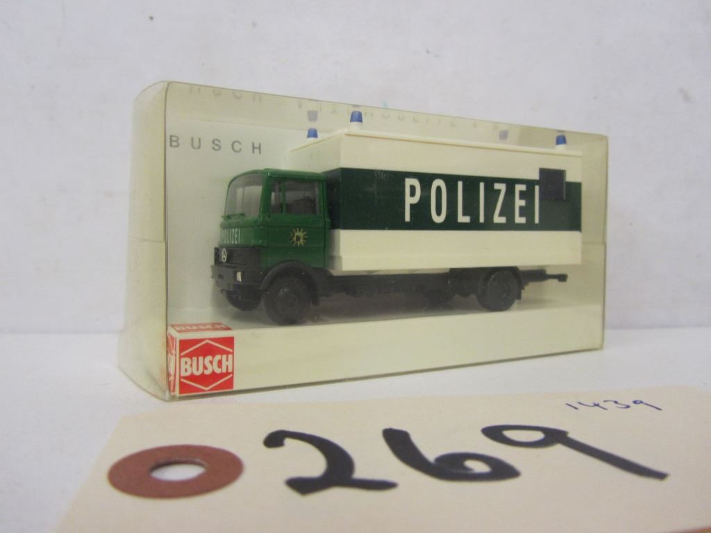 BUSCH Automodelle 1:87 Die Cast police vehicles 1) 44308 Mercedes 507D Polizei 2)40765 Mercedes LP809 Polzei 3) 40776 Mercedes LP809 THW 4) HO 5611 Car with flashing lights