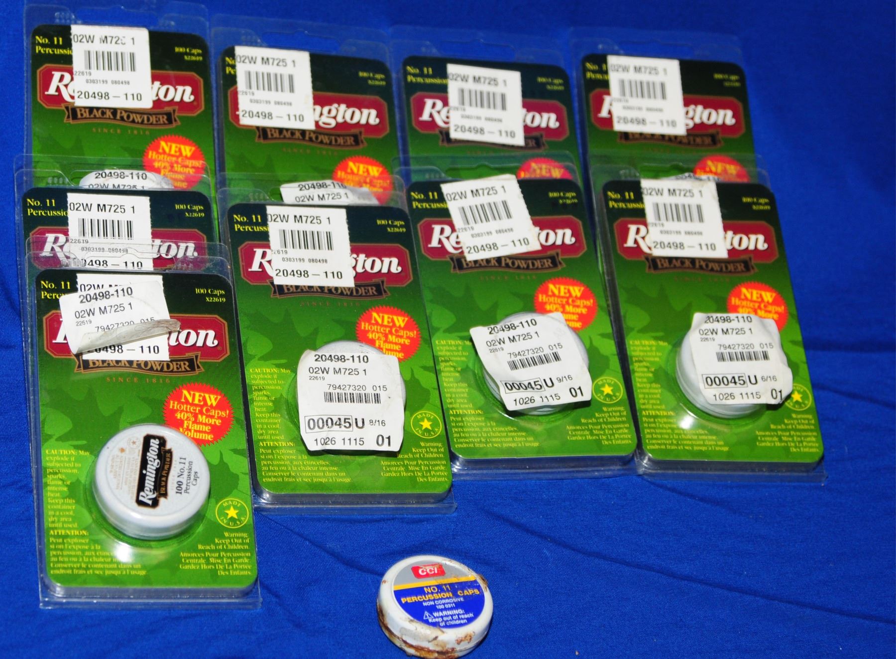 9 packs of unopened Remington 100 N0 11 Percussion Caps, plus 1 CCI No 11 percussion caps, unconfirmed amount in container.