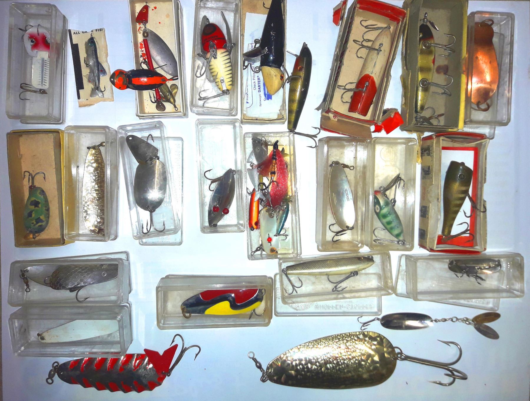 Roughly 30 lures many being vintage all in a vintage plastic tackle box