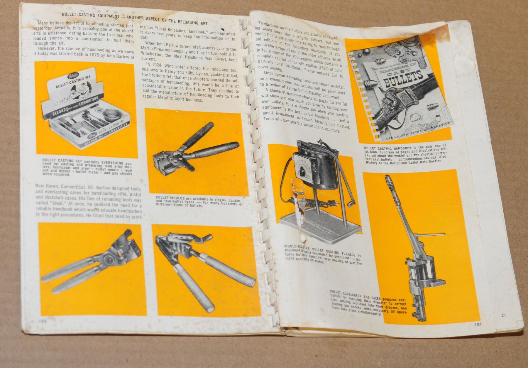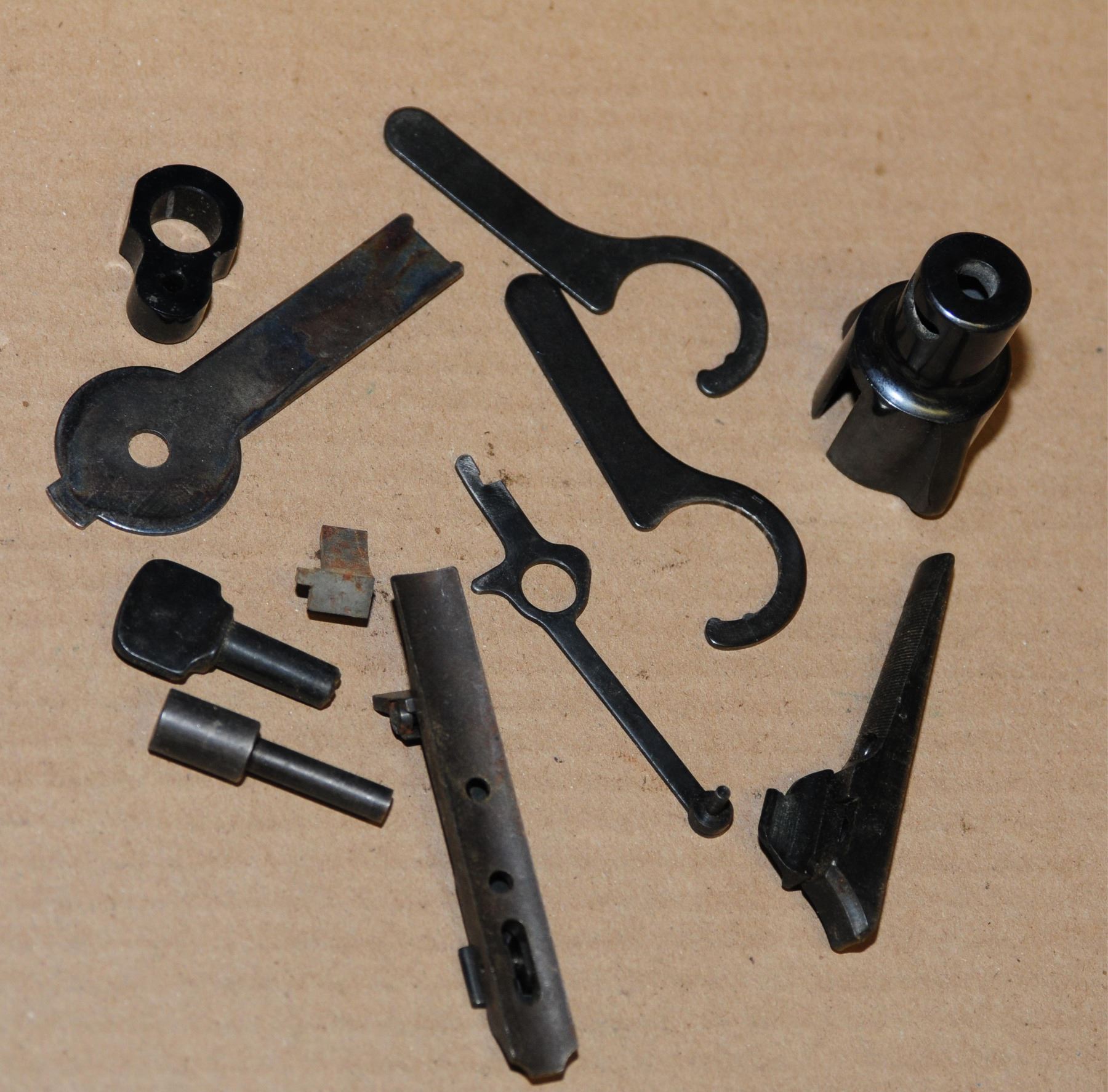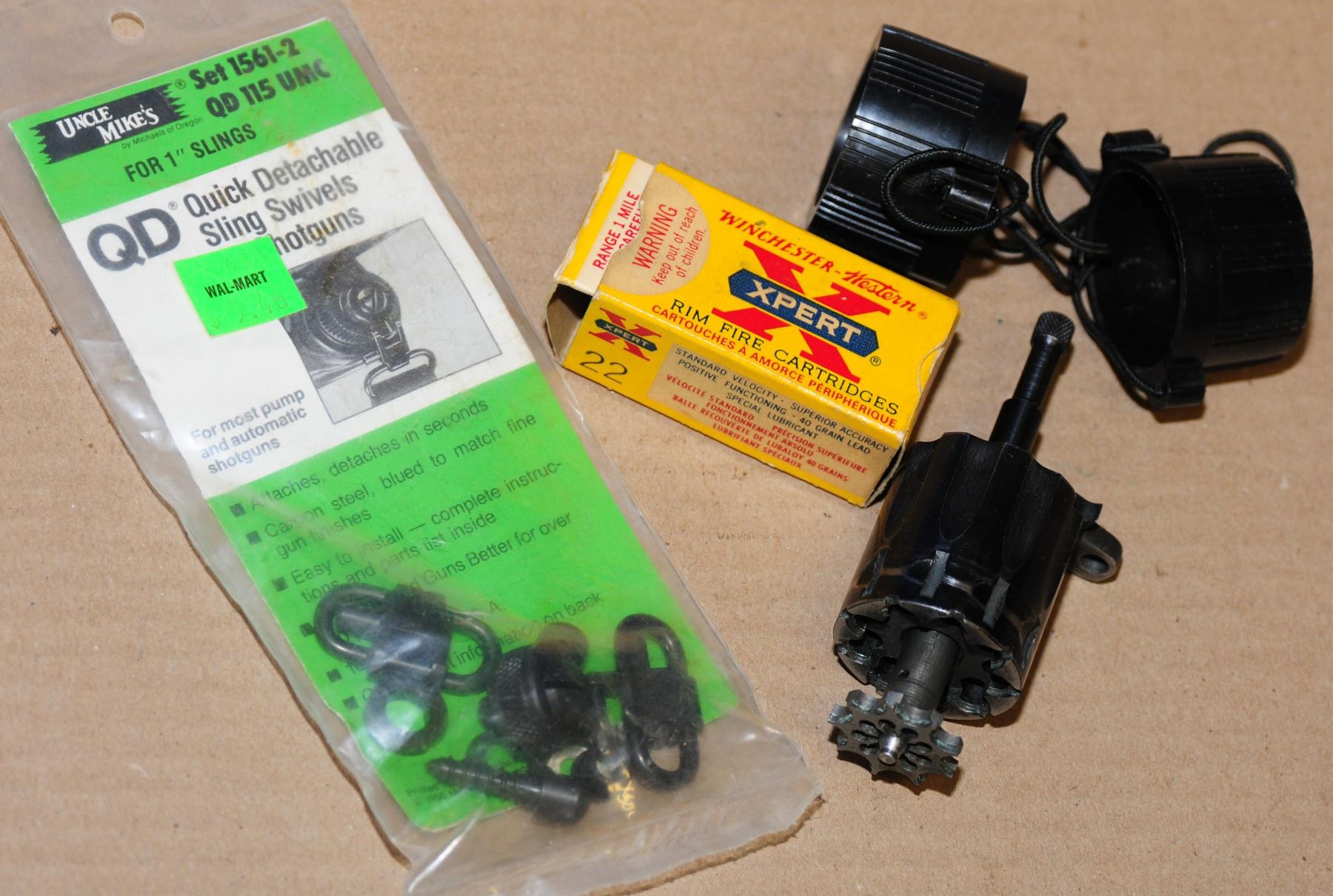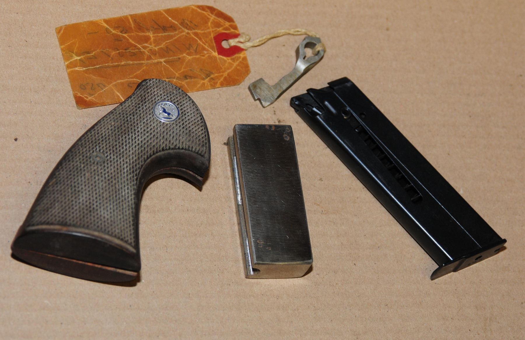 wooden pistol grips for a Colt revolver, unknown 9 shot 22 cylinder for a hand ejector, S&W 22 magazine, unknown barrel weight, Model 50 Win. hammer, rifle sights, Quick detachable sling swivels for a shotgun and a few unknown parts as well as a book on reloading