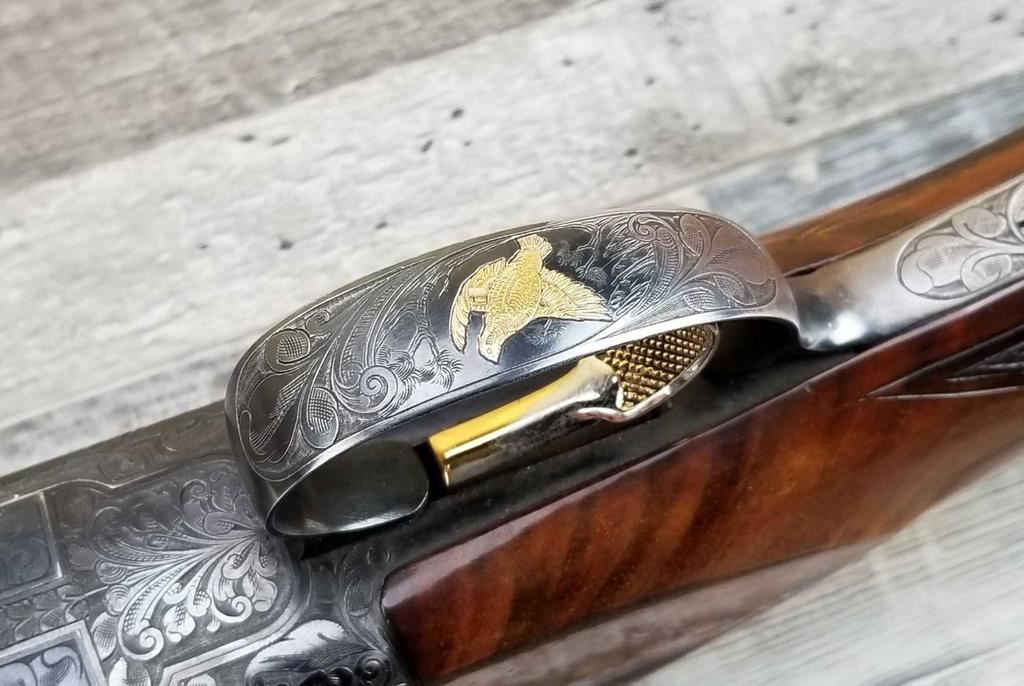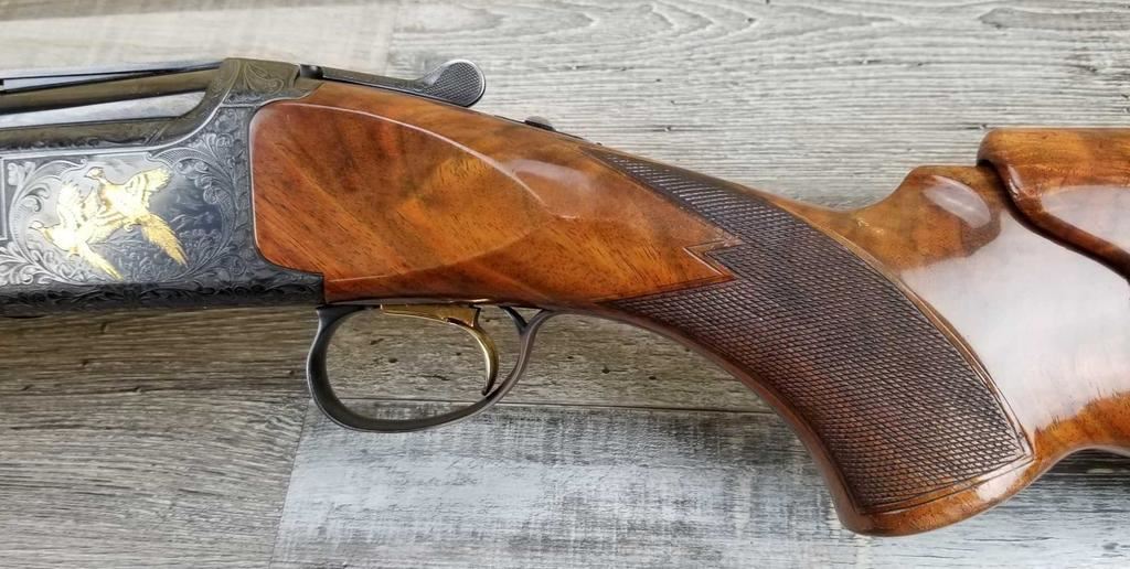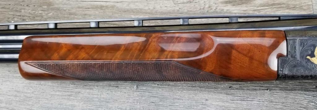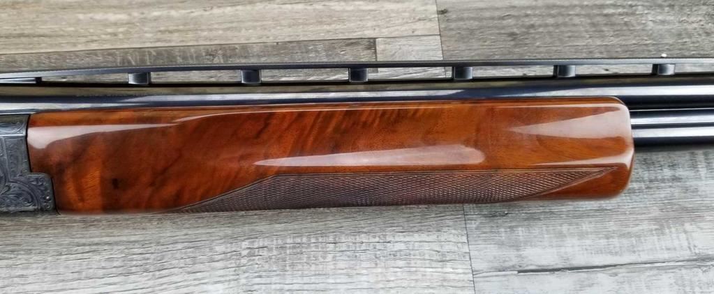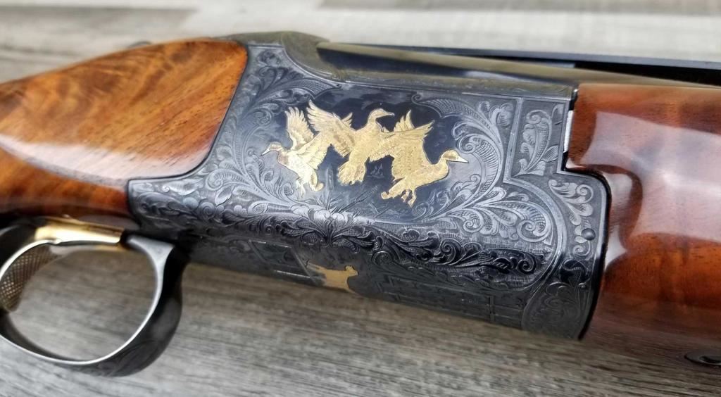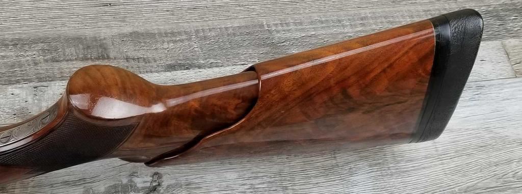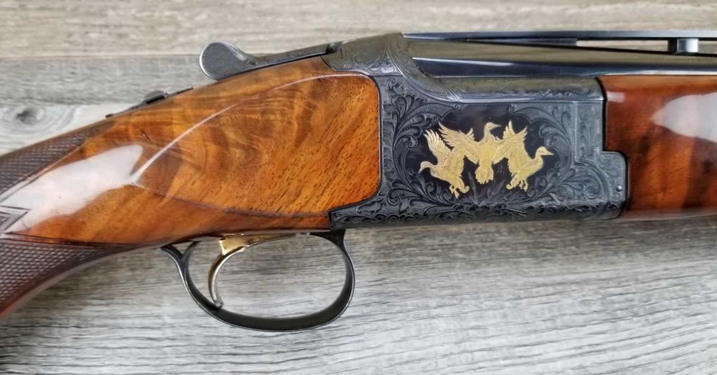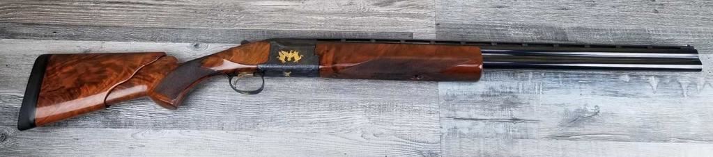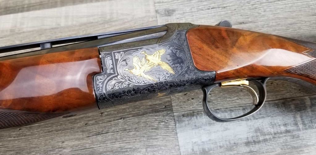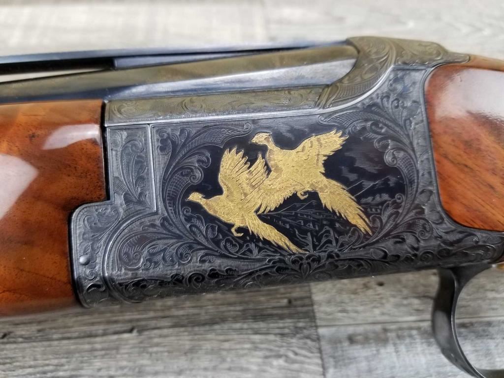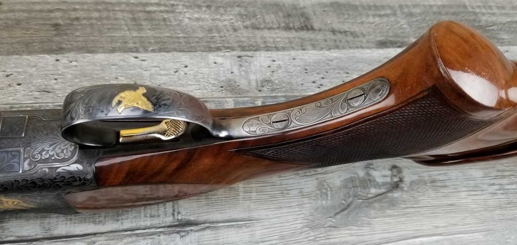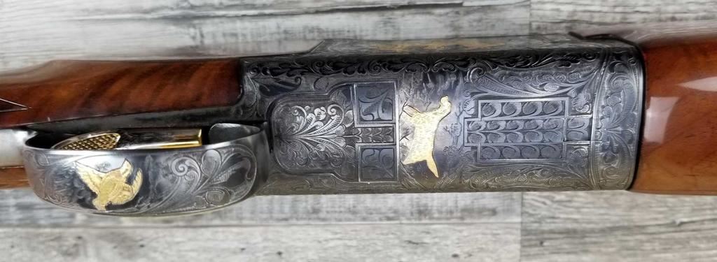 FACTORY ENGRAVED. WITH GOLD INLAYED BIRDS ON PANELS AND TRIGGER GUARD, WITH GOLD INLAYED DOG ON BOTTOM OF RECEIVER. SHOCK ABSORBER STOCK. LOP 13.5in. LOSS OF BLUE TO LOWER TANG. BRIGHT SHINY BORES, ON ALL FOUR SETS.